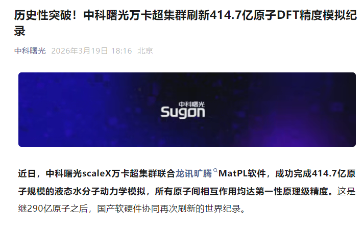 每经AI快讯,3月19日消息,中科曙光官方微信公众号发布重磅成果:其自主研发的scaleX万卡超集群系统,携手龙讯旷腾MatPL量子化学模拟软件,在液态水分子动力学模拟领域实现重大突破。该系统成功完成414.7亿原子规模的超大规模计算任务,所有原子间相互作用力均达到第一性原理计算精度标准。这一成果不仅刷新了该团队此前保持的290亿原子模拟纪录,更标志着国产高性能计算软硬件协同技术达到国际领先水平。 据技术团队介绍,本次模拟采用量子力学级别的计算精度,完整呈现了液态水分子在纳秒时间尺度下的动态演化过程。通过万卡级GPU集群的并行计算架构,系统实现了每秒千万亿次级别的浮点运算能力,为研究纳米流体、生物分子溶液等复杂体系提供了全新研究范式。中科曙光相关负责人表示,该技术突破将有力推动材料科学、生命科学等基础学科研究,为新能源开发、药物设计等领域提供关键计算支撑。 |