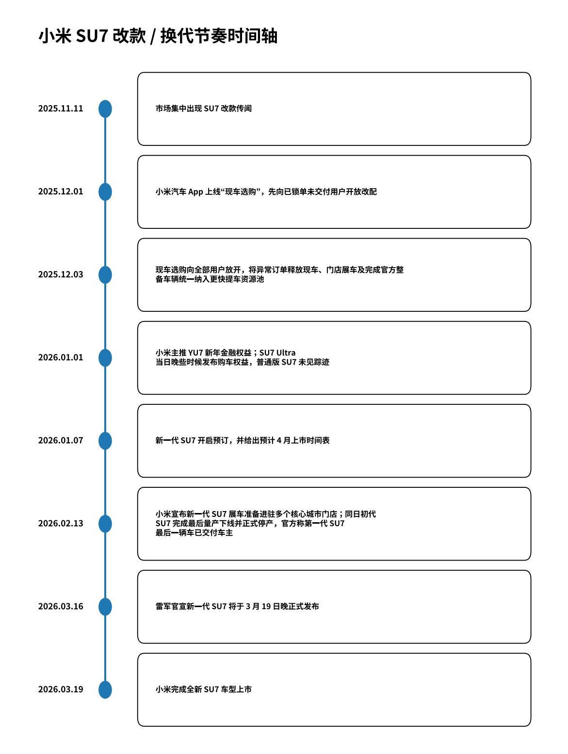 从时间线来看,自2025年11月11日市场集中出现SU7改款传闻起,至2026年3月19日晚新一代SU7正式发布,小米为这次中改切换准备了128天。与传统车企常见的切换方式不同,小米在这4个月内并未将旧款清尾、新款预热和现车拆解为彼此割裂的动作,而是保持了清晰连贯的节奏。 去年12月初,小米汽车App上线“现车选购”功能,先向已锁单未交付用户开放改配,再向全部用户放开,将异常订单释放出的现车、门店展车以及完成官方整备的车辆,统一纳入更快提车的资源池。 进入2026年,YU7的新年金融权益被率先推出,SU7则短暂退居幕后;一周后,新一代SU7开启预订,并给出预计4月上市的时间表。春节前后,这轮切换继续提速:新一代SU7展车准备进驻多个核心城市门店,初代SU7随后完成最后量产下线并正式停产,官方又在2月中旬宣布第一代SU7最后一辆车已交付车主。到3月16日,雷军官宣新一代SU7将于3月19日晚正式发布,持续四个月的预热、清尾、预订和切换,至此进入收尾阶段。 随着时间推移和小米对新车细节的持续披露,外界对这轮切换的讨论也在同步变化:关注点从最初的“会不会改、会改多少”,逐渐转向“旧款如何退场、新款如何承接,以及这套节奏究竟是不是一次更精细的切换”。 从已经采取的行动来看,小米这轮SU7切换的特别之处,不在于改款本身,而在于它试图同时满足几类并不完全一致的需求。 去年12月初上线的“现车选购”功能,并未将异常订单释放出的现车、官方展车和完成修复及附加检验的车辆简单地进行尾端折价处理,而是将这些来源不同、状态不同的车源重新纳入同一资源池;已锁单未交付用户可以优先改配同车型现车,而愿意等待新一代SU7的用户,则仍沿着预订、排产、展车进店和交付的常规流程推进。到2月中旬,第一代SU7完成最后交付,这套切换也从旧款资源消化逐步过渡到新款承接。 这套安排之所以重要,在于它试图同时照顾三拨利益诉求并不一致的人:对于首发车主和已购旧款用户而言,新一代SU7没有通过外观大整容、核心配置代差式跃迁或价格体系重洗,迅速将旧款打成“过时产品”;对于购买现车的消费者,立等可取并不直接等同于被迫接盘;对于持币待购的消费者而言,新车确实补上了一部分高频痛点和配置短板,继续等待也有了更明确的理由。换句话说,这轮切换实现了减少浪费和背刺顾客的风险,但同时也意味着改款幅度需要被小米有意控制在“查漏补缺、继续打磨”的区间。 从这个层面上看,这轮切换更容易被视为一次订单和交付端的系统再组织。多个社交平台的搜索结果显示出一个趋势:SU7现车、旧款退场和新款承接的外部舆论,天然比官方口径更为嘈杂——未抢到现车的用户、已经在线下看过中改展车的人、仍在释放初代SU7乃至SU7 Ultra和YU7货源信号的销售端账号、质疑展车或整备车被当作新车销售的批评者,以及转向二手市场的买家,往往会同时出现在同一组讨论里。 记者在梳理相关信息后发现,官方口径显示第一代SU7已在2月中旬完成最后交付,但门店侧和社交平台上关于“现车”的表述,仍可能混杂着不同车源状态、不同销售话术和不同时间点的信息。 这些噪音本身恰恰说明,即便相关车源在终端层面仍有外溢,小米对外试图建立的,仍是一种更接近低库存、低损耗的切换叙事。