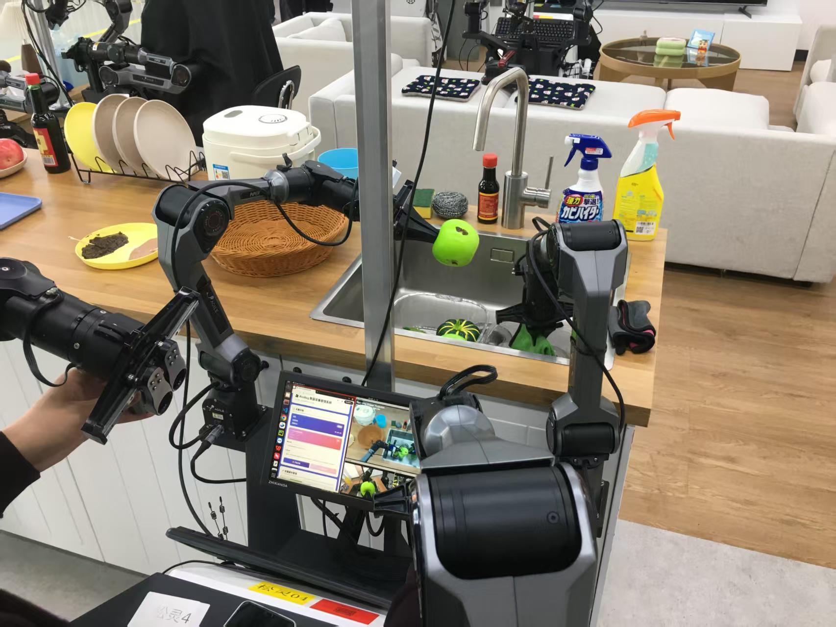 四天前,负责操控机器人洗水果的操作员收到了一份详细的任务文档。他需严格按照客户要求,在四个仿真水果表面涂抹模拟污渍,随后通过遥操作器控制机械臂完成一系列动作:拿起水果、打开水龙头、擦洗污渍、将水果放回篮中。只有四个水果全部清洗完毕,才算完成一遍训练流程。 遥操作器配备了两只机械臂,每只机械臂拥有六个关节,其中三个可横向移动,三个可纵向移动,与实际执行任务的机器人关节一一对应。尽管设计精密,但机械臂的灵活性仍不及人类关节,导致动作速度相对缓慢。 截至目前,该操作员已重复完成160遍任务,累计清洗了640个水果。而客户的要求是500遍,这意味着他还需至少保质保量地重复六天。这500条数据,旨在帮助大模型理解“洗净水果”的具体标准——不仅需要采集“清洗”动作的数据,还需通过机器人夹爪及顶端的摄像头,捕捉“干净”状态的视觉信息。此外,操作员需实时更换背景元素,如将洗手池上的清洁剂替换为洗洁精,或调整海绵擦与钢丝球的位置,以增强模型的泛化能力,确保机器人在不同场景下均能完成任务。 这只是北京人形机器人创新中心数据与训练基地的众多场景之一。基地还根据客户需求,搭建了家居、商超、办公、工业、医药、康养等30余个领域的应用场景。目前,120余台机器人正在人工操控下,以缓慢而精准的动作完成指定任务,如摆放水果、给婴儿更换尿布、整理工具箱、将矿泉水从冰箱搬运至收银台等。每个动作均需重复上百次,以确保数据质量。