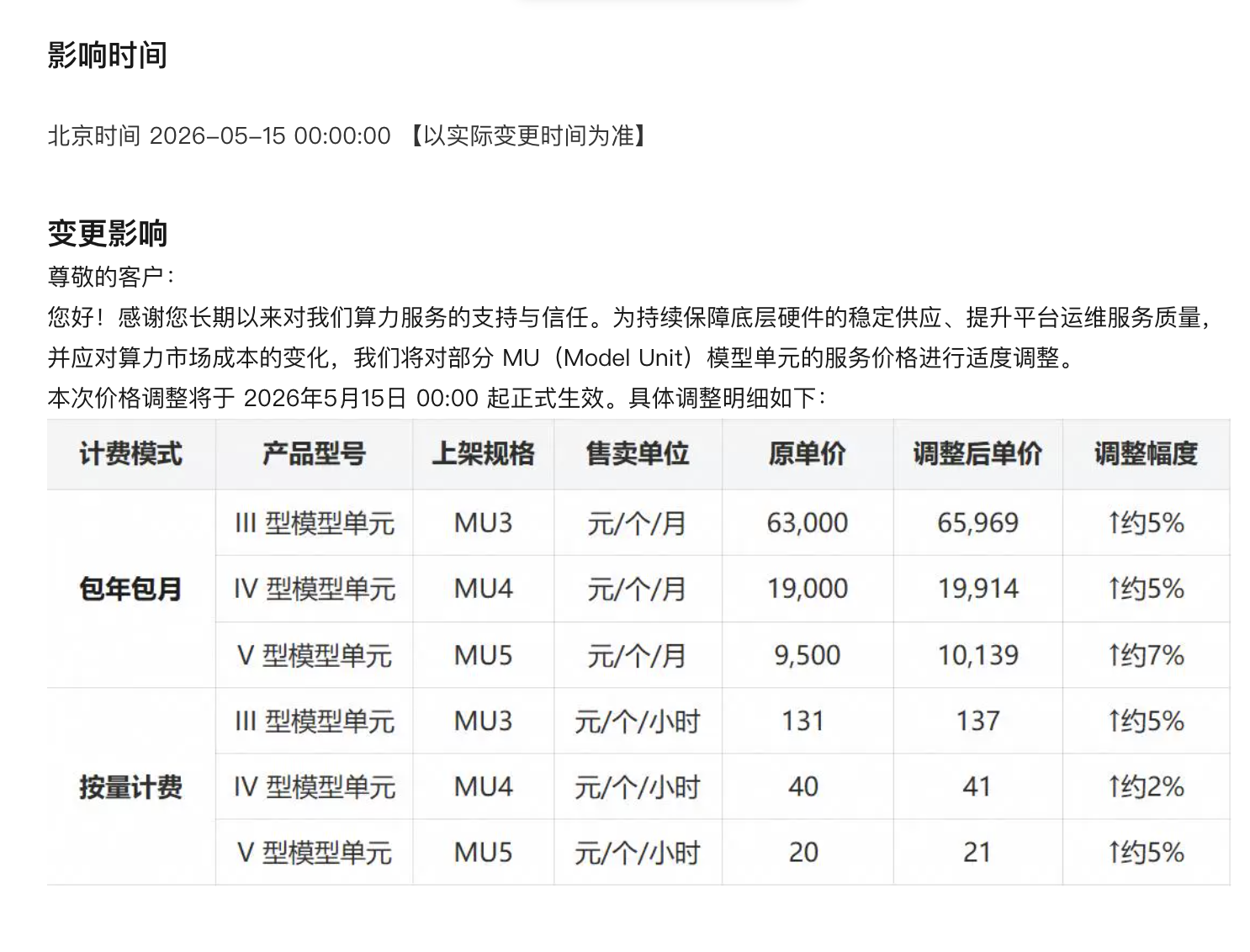 在4月15日这一天,阿里云正式对外发布了一则重要公告。公告指出,为了能够持续且稳定地保障底层硬件的充足供应,进一步提升平台运维服务的整体质量,同时积极应对算力市场成本不断变化的情况,阿里云经过审慎考虑后决定,将对部分MU(Model Unit)模型单元的服务价格展开适度的调整工作。此次价格调整并非随意为之,而是基于多方面的综合考量。据了解,本次价格调整计划将于2026年5月15日00:00这个时间节点正式开始生效,届时相关服务价格将按照新的标准执行。 |