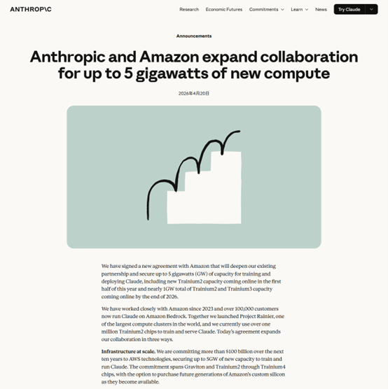徽声在线4月21日讯(编辑 卞纯)当地时间4月20日,科技巨头亚马逊与人工智能公司Anthropic宣布达成一项重大合作协议,进一步深化双方的战略伙伴关系:亚马逊计划向Anthropic追加投资高达250亿美元,而Anthropic则承诺在未来十年内,将在亚马逊云服务(AWS)技术上投入超过1000亿美元,以加速算力扩张。 作为此次合作的重要组成部分,亚马逊已同意向Anthropic追加巨额投资。在此之前,亚马逊已向这家AI初创公司注资80亿美元,显示出对Anthropic技术实力和市场前景的高度认可。 根据双方发布的公告,亚马逊的这笔投资将分阶段进行,包括立即向Anthropic注资50亿美元,以及未来根据“特定商业里程碑”的达成情况,再追加最高200亿美元的投资。此次初始投资是基于Anthropic最新高达3800亿美元的估值进行的。 亚马逊首席执行官Andy Jassy在声明中表示:“Anthropic承诺未来十年将在AWS Trainium上运行其大语言模型,这充分体现了我们在定制芯片领域所取得的共同进展。我们将继续致力于为客户提供构建生成式人工智能所需的技术和基础设施支持。” 当前,全球各大云服务厂商都在竞相扩充AI算力,以满足日益增长的市场需求。亚马逊今年2月曾透露,预计到2026年,其资本支出将达到约2000亿美元,其中大部分将用于AI基础设施的建设和升级。 Anthropic承诺千亿美元投向AWS技术,引领AI算力新篇章 在周一发布的公告中,Anthropic明确表示,未来十年内,该公司将斥资超过1000亿美元用于AWS的相关技术,包括亚马逊自研的AI芯片Trainium的现有及新一代产品。这一举措将显著提升Anthropic的算力水平,为其在AI领域的持续创新提供有力支撑。 Anthropic还透露,其已为Claude AI模型的训练和部署锁定了高达5吉瓦的算力资源,以确保模型的稳定运行和持续优化。 据Anthropic介绍,到今年年底,将有总计近1吉瓦的Trainium2和Trainium3芯片算力投入使用,进一步增强其算力储备。 值得一提的是,就在两个月前,亚马逊还宣布向Anthropic的主要竞争对手OpenAI投资最高500亿美元。这两家AI公司正加紧向投资者展示自身实力,为最快于今年启动的IPO做准备。近几个月来,OpenAI高管多次批评Anthropic犯下“战略失误”,称其未能提前锁定足够的算力资源。 Anthropic周一表示,随着企业和开发者对Claude的需求不断增长,以及消费者使用量的“急剧上升”,其基础设施已面临“不可避免的压力”,影响了服务的可靠性和性能。该公司表示,与亚马逊达成的新协议将有助于其快速扩充可用算力,满足市场需求。 “我们的用户告诉我们,Claude正日益成为他们工作中不可或缺的工具。因此,我们需要建设更强大的基础设施,以跟上快速增长的需求。”Anthropic首席执行官Dario Amodei在声明中表示,“与亚马逊的合作,将让我们在持续推进AI研究的同时,为客户提供更优质的Claude服务。” Anthropic成立于2021年,由一群从OpenAI离职的研究人员和高管创立。该公司以其Claude系列AI模型而闻名,并在企业客户市场取得了显著成绩,年化营收已突破300亿美元。 2023年,Anthropic将AWS定为首选云服务商,2024年又将其列为核心训练合作伙伴。不过,该公司同时也与微软、谷歌等算力提供商签署了合作协议,以确保算力资源的多元化和稳定性。 去年11月,微软同意向Anthropic投资高达50亿美元,Anthropic则承诺购买价值300亿美元的Azure算力。本月初,Anthropic还扩大了与谷歌和博通的合作,以获得“数吉瓦”级别的算力支持,进一步巩固其在AI领域的领先地位。 |
