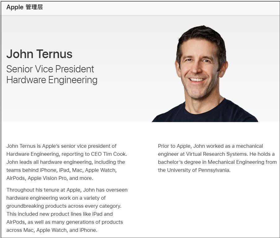 苹果高层变动引发关注,“换帅”消息迅速成为科技圈热议焦点。 从乔布斯时代到库克掌舵,再到如今约翰·特努斯(John Ternus)接棒,每一次权力交接都承载着外界对苹果未来创新的期待——人们始终好奇,这位新任掌门人能否再现“iPhone时刻”的辉煌。 据徽声在线报道,美国苹果公司于4月20日正式宣布,长期主导硬件业务的约翰·特努斯将出任下一任首席执行官,而库克将于9月1日起转任执行董事长,开启公司领导层的平稳过渡。 作为苹果30年来首位以硬件研发为核心职业路径的CEO,现年50岁的特努斯与2011年库克接替乔布斯时的年龄完全一致,这一巧合被业界解读为苹果选择稳健接班策略的信号。 25年深耕:从游泳冠军到硬件掌门人 在乔布斯与库克两位“明星级CEO”树立的极高标杆下,特努斯的继任无疑承载着巨大压力。但苹果选择这位“75后”高管,背后是其25年如一日的专注与积累。 特努斯的职业生涯虽无跌宕起伏的创业传奇,却以稳健的步伐在硬件领域深耕细作。大学时期,他不仅是成绩优异的学霸,更是游泳健将,曾在一场比赛中同时斩获50米自由泳和200米个人混合泳冠军,展现出卓越的体能与专注力。 1997年,他从宾夕法尼亚大学机械工程专业毕业,随后加入“虚拟研究系统”公司,专注于VR头显和沉浸式技术研发。这段经历让他接触到当时最前沿的显示技术与交互界面,为日后在苹果的硬件创新奠定了基础。 2001年,特努斯正式加入苹果,从产品设计团队起步,逐步晋升:2013年成为硬件工程副总裁,2020年接管iPhone硬件工程部门,2021年擢升为硬件工程高级副总裁并进入核心高管团队。苹果官网显示,他目前直接向库克汇报,主导着公司最核心的硬件业务。 在苹果任职期间,特努斯的贡献覆盖全线产品:从每一代iPad的设计,到iPhone系列和AirPods的硬件工程,再到Mac向自研芯片过渡的关键决策,他均扮演着核心角色。库克曾公开评价,特努斯“深厚的专业知识和广泛的阅历”,使他成为硬件工程团队“大胆而富有远见的领导者”。 “硬件狂人”的执念:像爱孩子一样爱产品 在接受媒体采访时,特努斯曾被问及如何分配精力管理苹果庞大的硬件产品线。他幽默回应:“这就像问我最喜欢哪个孩子一样——我爱所有硬件,几乎每天都在使用它们。亲身体验对我是最重要的。” 这种“用户视角”的执念,让他成为苹果硬件精密运转的“总指挥”。从iPad到Mac,从AirPods到iPhone,他需整合设计、芯片、软件等所有团队,确保每一环节无缝衔接。而他最引以为傲的成就之一,是推动Mac从英特尔芯片向自研芯片的转型。 这一变革不仅让Mac芯片更节能、效率更高、发热更小,甚至彻底改变了笔记本电脑的设计逻辑——如今,许多竞品仍需风扇散热,而Mac笔记本已实现无风扇设计。自2020年转型以来,Mac销量大幅攀升,成为苹果业绩增长的重要引擎。
