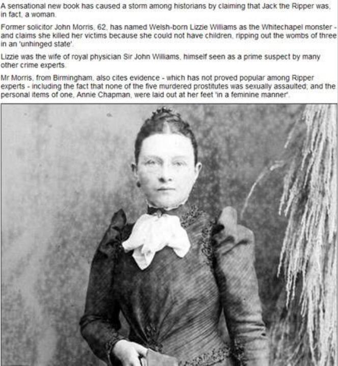 开膛手杰克为什么只杀妓女? 有人曾经怀疑杀害这些妓女的凶手可能是一位女性,名莉齐·威廉姆斯,她是英国王室医生约翰·威廉姆斯的夫人,据说是因为自己无法生育,被自己的丈夫另眼相待,在这5位受害人中有三名女性的子宫被割掉,这5 名受害着中还有一位和自己的丈夫长期有染。在极其愤怒的情况下对死者进行杀害。可惜的是,这名残忍的凶手一直没有被调查出来。 莉齐·威廉姆斯 开膛手杰克抓到了吗? 开膛手杰克在杀害完第5名女性后便销声匿迹,当年警察局的人竭尽全力的去寻找凶手,但是最后没有任何证据,一直无法破案,不过最近有人在其中一位受害人的披肩上发现了发现了杀人凶手的精液以及血液,通过DNA检验之后,断定了凶手可能是当年的一名波兰理发师,据说这名理发师叫寇斯敏,1881年的时候跟着家人来到英国定居,后来的了严重的精神病并被送往精神病院,1919年在精神病院去世。但有人表示这块披肩毕竟经历了这么多年,有可能早就已经被污染了,凶手是否真的是寇斯敏谁也无法确定。 开膛手杰克画像 |