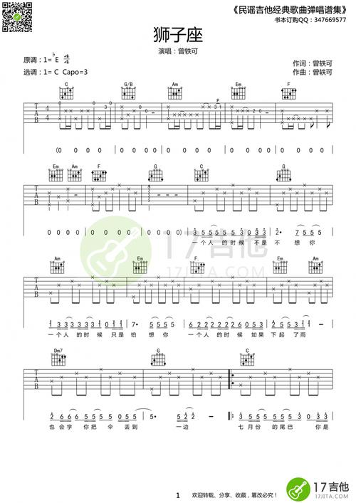 《狮子座》吉他谱详解:曾轶可经典曲目C调简易版弹唱指南,六线谱搭配高清音频,初学者尤其是女生不容错过的入门佳作!这首歌曲旋律清新,和弦进行流畅,非常适合吉他新手练习弹唱。 狮子座吉他谱核心节奏解析作为曾轶可代表作的《狮子座》,其扫弦节奏具有独特韵律感: 进阶弹奏技巧拓展![]() 针对易混淆节奏型对比: 完整和弦进行教学主歌部分和弦链: 实战弹唱建议1. 分段突破法:先单独练习主歌/副歌的和弦转换,再结合扫弦节奏 |