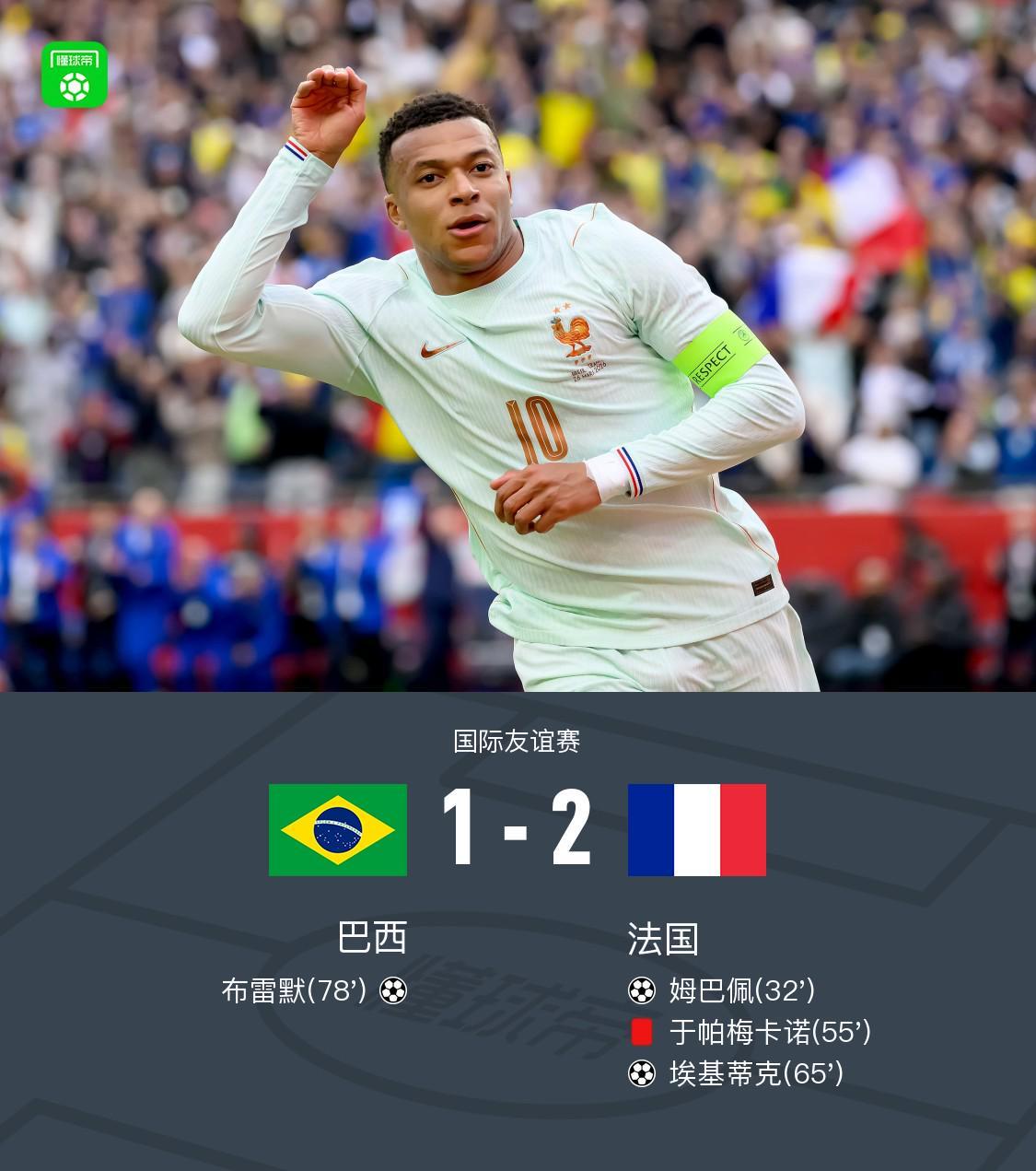 北京时间3月27日,在一场备受瞩目的国际友谊赛中,巴西队与法国队展开激烈对决。上半场赛事里,姆巴佩凭借登贝莱的精准直塞,抓住单刀机会轻松挑射破门,为法国队先拔头筹。下半场风云突变,于帕梅卡诺因犯规被裁判观看VAR后直接出示红牌罚下,使得法国队陷入少一人作战的不利局面。随后,奥利塞送出直塞妙传,埃基蒂克轻挑破门,进一步扩大法国队的领先优势。不过,巴西队并未放弃,布雷默在关键时刻包抄破门,为巴西队扳回一城。最终,全场比赛结束,巴西队1 - 2负于法国队。 关键赛事节点回顾 比赛进行到第31分钟,姆巴佩获得绝佳的单刀机会,他冷静地挑射,皮球越过巴西队门将,稳稳落入球门,巴西队0 - 1暂时落后法国队 第54分钟,场上形势突变,于帕梅卡诺在禁区边缘放倒了韦斯利,裁判在观看VAR回放后,果断出示红牌将于帕梅卡诺罚下,法国队不得不以十人应战。 第65分钟,奥利塞展现出了出色的传球视野,他送出一记直塞,埃基蒂克心领神会,轻挑破门,巴西队0 - 2落后法国队,局势愈发严峻 第79分钟,巴西队发起猛烈反击,布雷默抓住机会包抄破门,成功为巴西队扳回一球,此时巴西队1 - 2法国队,比赛悬念再起