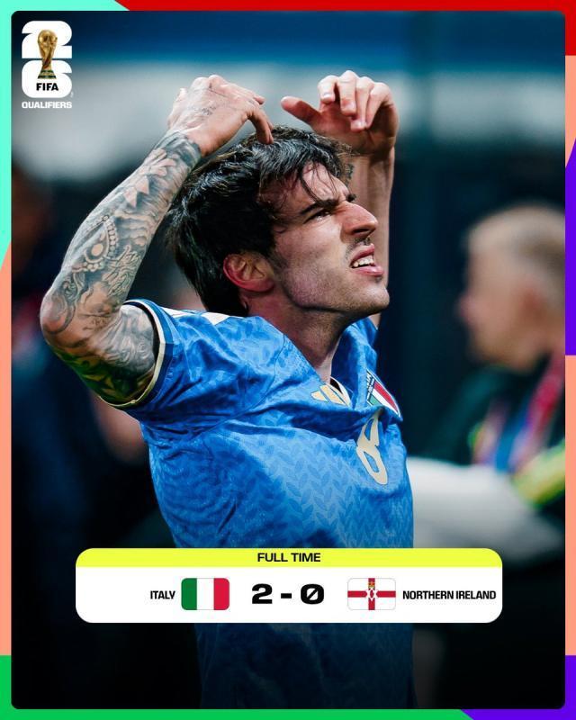 徽声在线全媒体讯 在世预赛欧洲区附加赛半决赛的激烈角逐中,意大利队坐镇蓝色竞技场,以一场酣畅淋漓的2比0完胜北爱尔兰,成功晋级决赛,将与波黑队展开一场关乎世界杯入场券的终极对决。本场比赛中,托纳利表现抢眼,不仅以一记精彩绝伦的世界波打破僵局,还助攻莫伊塞·基恩锁定胜局,成为意大利队获胜的最大功臣。 与此同时,A组的另一场焦点战在威尔士与波黑之间展开。双方常规时间战成1比1平,哲科在第86分钟的绝平进球让比赛悬念重生。然而,加时赛中双方均未能再破门,最终通过点球大战,波黑队以4比2胜出,惊险晋级,将与意大利队争夺那宝贵的世界杯门票。 上半场,双方均显得较为谨慎,未能创造出太多有威胁的进攻机会,比分也一直维持在0比0。 比赛进行到第56分钟,场上风云突变。波利塔诺在右侧精准起球,将球送入禁区。北爱尔兰防守球员解围不远,托纳利抓住机会,在禁区边沿迎球凌空爆射,皮球如炮弹般直窜网窝,意大利队1比0领先!这一进球彻底点燃了现场球迷的热情。 第79分钟,意大利队再次发动攻势。右路开界外球后,巴雷拉迅速下底传中,莫伊塞·基恩倒勾射门,可惜皮球稍稍偏出底线,错失扩大比分良机。 仅仅一分钟后,意大利队卷土重来。托纳利高球吊入禁区,基恩右脚巧妙卸球调整后,左脚低射破门,2比0!意大利队锁定胜局,现场再次陷入狂欢。 全场数据统计显示,意大利队主场作战优势明显,全场控球率高达63%,射门次数19比8遥遥领先,射正次数8比1,预期进球数也以1.40比0.41占据绝对优势。这样的数据无疑是对意大利队出色表现的最好诠释。 根据赛程安排,意大利队将于3月31日作客波黑泽尼察,与波黑队展开一场生死较量,争夺最后的世界杯入场资格。这场比赛无疑将吸引全球球迷的目光。 意大利队本场首发阵容(352):唐纳鲁马/詹卢卡·曼奇尼、巴斯托尼(63’加蒂)、卡拉菲奥里/波利塔诺(83’帕莱斯特拉)、巴雷拉、洛卡特利、托纳利(83’皮西利)、迪马尔科/莫伊塞·基恩(88’拉斯帕多里)、雷特吉(63’皮奥·埃斯波西托) 其他场次比分速递: A组战况 意大利2比0完胜北爱尔兰 威尔士1比1战平波黑(点球大战2比4告负) 决赛对阵:波黑vs意大利 B组战况 乌克兰1比3不敌瑞典 (哲凯赖什上演帽子戏法,成为瑞典队获胜最大功臣) 波兰2比1逆转阿尔巴尼亚 (莱万、泽林斯基联袂破门,助波兰队逆转取胜) 决赛对阵:瑞典vs波兰 C组战况 土耳其1比0小胜罗马尼亚 (居莱尔妙传卡迪奥卢,后者制胜一击助土耳其队获胜) 斯洛伐克3比4惜败科索沃 决赛对阵:科索沃vs土耳其 D组战况 丹麦4比0大胜北马其顿 捷克2比2战平爱尔兰(点球大战4比3胜出) 决赛对阵:捷克vs丹麦 注:以上比分列前者为主队,决赛时间均为当地3月31日,敬请球迷朋友们准时关注。 |