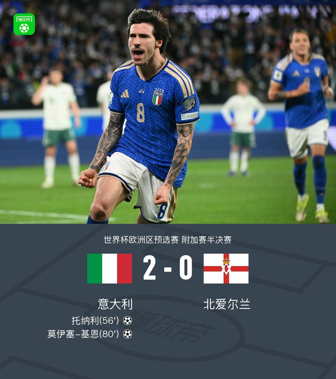 北京时间3月27日,在世界杯欧洲区预选赛附加赛半决赛的激烈角逐中,意大利队与北爱尔兰队展开了一场惊心动魄的对决。上半场,意大利队的基恩和雷特吉多次制造威胁,可惜未能转化为进球。下半场风云突变,托纳利先是以一记精彩的远射打破僵局,随后又助攻基恩再下一城。最终,意大利队以2-0的比分战胜北爱尔兰,成功晋级附加赛决赛。 关键事件回顾 比赛进行到第56分钟,北爱尔兰队后卫解围失误,球不远地落在了托纳利脚下。他毫不犹豫,凌空抽射,皮球如炮弹般直飞球门,意大利1-0领先北爱尔兰。 第80分钟,意大利队再次发动攻势。基恩巧妙地晃开对方后卫,推射远角得手,将比分扩大为2-0,彻底锁定了胜局。