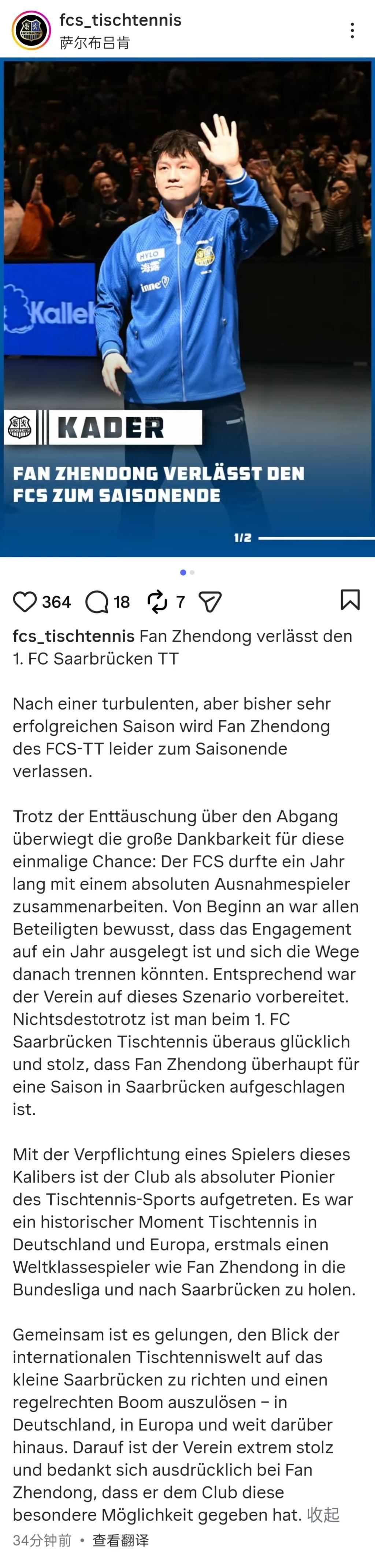 3月16日,德国乒乓球界传来一则重要消息,萨尔布吕肯乒乓球俱乐部在其官方社交媒体平台上正式宣布,中国乒乓球名将樊振东将在本赛季圆满结束后,结束与该俱乐部的合作,开启新的征程。 面对这一变动,樊振东在接受采访时深情地表示:“我首先要向萨尔布吕肯乒乓球俱乐部致以最深的谢意,是他们在我职业生涯的关键时刻,给予了我这个无比珍贵的机会,让我能够在欧洲顶级联赛中锻炼成长。这段经历,无疑是我职业生涯中浓墨重彩的一笔。然而,在职业生涯的这一重要节点,我渴望挑战自我,探索新的可能。杜塞尔多夫俱乐部,作为欧洲乃至全球乒乓球领域的佼佼者,其强大的实力和深厚的底蕴深深吸引着我。同时,我与德国乒乓球传奇人物波尔(Timo Boll)之间建立的深厚友谊,也成为了我勇敢迈出这一步的重要动力。 展望未来,我满怀期待地想象着,明年以对手的身份与萨尔布吕肯俱乐部在赛场上相遇,那将是一种何等特别的体验。但在此之前,我的注意力仍然集中在当前赛季的每一场比赛上。我承诺,在赛季的最后一场比赛哨声响起之前,我将倾尽全力,与队友们并肩作战,共同为创造属于我们的历史而努力拼搏。” |
