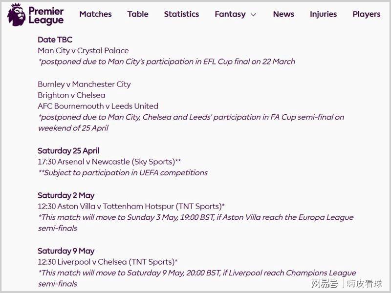 随着足总杯八强赛事的圆满落幕,英超联赛官方迅速对部分比赛的日程安排做出了调整,正式宣布有四场关键对决将更改比赛日期,这些比赛涉及阿森纳、切尔西以及利物浦等英超豪门球队,同时还有另外三场比赛的时间存在变动可能性。 步入赛季的中后阶段,由于各项赛事的密集安排,赛程冲突导致的比赛改期现象愈发频繁。回顾上个月,联赛杯决赛的举行就迫使英超联赛为其让路。其中,阿森纳与狼队的较量早已提前一个月完成,而水晶宫与曼城则因继续征战欧协联或足总杯,两队的空闲比赛日始终未能重合,导致双方的对决至今仍未确定延期后的具体日期。 根据英超官方公布的最新时间表,除了曼城与水晶宫的这场未定日期的比赛外,由于足总杯半决赛与英超第34轮的时间冲突,曼城客场挑战伯恩利、切尔西客场对阵布莱顿,以及利兹联客场迎战伯恩茅斯这三场比赛,均已被标注为TBC(待定),意味着它们已经确定将改期举行,但具体的时间安排还需进一步协调与落实。 目前,共有四场比赛等待确定新的比赛时间。此外,英超官方还对另外三场比赛加上了可能改期的说明。同样是在英超第34轮,这一轮恰好安排在欧冠半决赛的前夕,如果阿森纳能够成功淘汰葡萄牙体育,那么他们联赛中面对纽卡斯尔的比赛时间可能会进行微调。 同样面临微调可能的还有两场比赛。如果阿斯顿维拉能够闯入欧联杯半决赛,那么英超第35轮将恰好夹在欧联杯两回合比赛的中间,因此阿斯顿维拉主场迎战热刺的比赛可能会推迟一天进行。 类似地,如果利物浦能够闯入欧冠半决赛,那么英超第36轮他们与切尔西的强强对话,比赛时间可能会从原定的北京时间晚上7点半推迟几个小时,变为深夜时分进行,这对于两队的国内球迷来说,无疑将增加观赛的难度与辛苦程度。 当然,这份时间表还存在一定的不确定性。足总杯决赛与英超第37轮的时间重合,意味着无论曼城、切尔西还是利兹联谁能够晋级决赛,他们的联赛都将需要再次让路。具体的调整方案,还需等待几周后的半决赛结束后才能确定。 对于曼城和切尔西来说,他们分别有两场和一场比赛等待安排补赛,且都面临着三线作战的繁重任务。已经收获联赛杯冠军的曼城,还有两个冠军可以争夺;而切尔西的重要目标则应该是争取英超前五的位置,以获得下赛季的欧冠资格。如果切尔西能够获得足总杯冠军但却失去欧冠资格,相信这是不少球迷所不愿看到的。 |