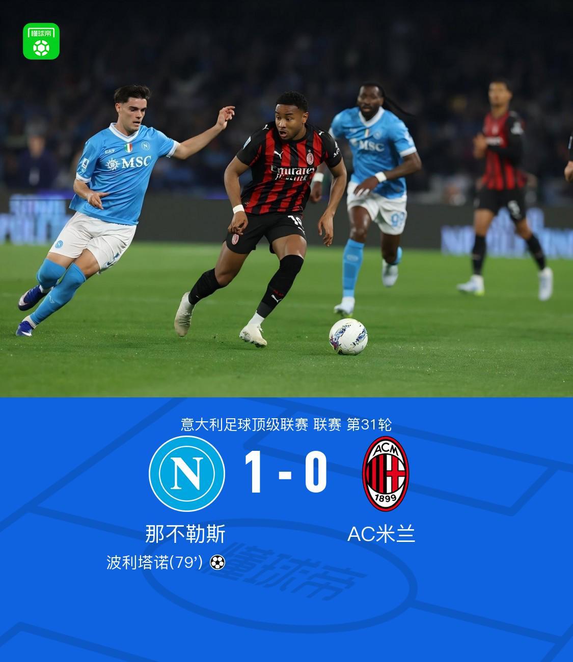 北京时间4月7日晚间,意大利足球顶级联赛第31轮迎来一场焦点对决,那不勒斯坐镇主场迎战来访的AC米兰。比赛进入下半场后风云突变,奥利韦拉在左路送出精准传中,波利塔诺机敏后插上,凌空打门得手,凭借这粒制胜进球,那不勒斯以1-0的比分力克AC米兰。 本场关键事件回顾 比赛进行到第79分钟,那不勒斯在左路发起攻势,奥利韦拉的传中球精准找到后点的波利塔诺,后者不负众望,射门得分,帮助那不勒斯取得1-0领先。