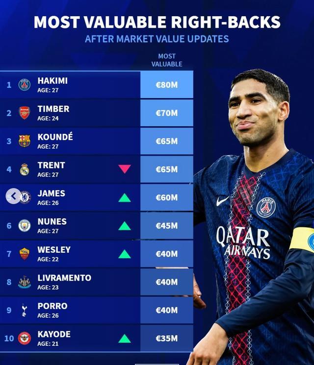 北京时间4月7日消息,权威转会数据网站德国转会市场(德转)最新发布了全球足坛右后卫身价排行榜单。在这份备受关注的榜单中,巴黎圣日耳曼的摩洛哥国脚阿什拉夫以8000万欧元的高昂身价稳居榜首,阿森纳新援廷贝尔则以7000万欧元紧随其后,巴塞罗那后卫孔德凭借6500万欧元的身价位列第三。