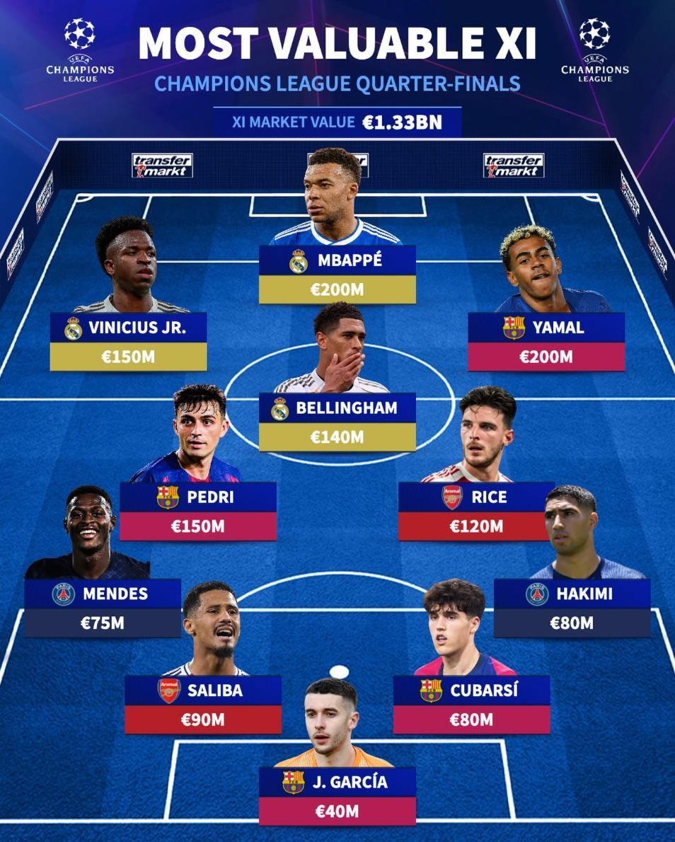 北京时间4月7日,随着欧冠1/4决赛首回合的战火即将点燃,权威转会数据网站德国转会市场(德转)精心挑选并公布了本赛季欧冠1/4决赛中身价最为昂贵的11人豪华阵容。在这份星光熠熠的名单中,姆巴佩与亚马尔以高达2亿欧元的身价傲视群雄,成为领衔人物。值得一提的是,巴塞罗那足球俱乐部有4名球员荣耀入选,皇家马德里则有3名球员榜上有名,而阿森纳与巴黎圣日耳曼也各有2名球员跻身此列。