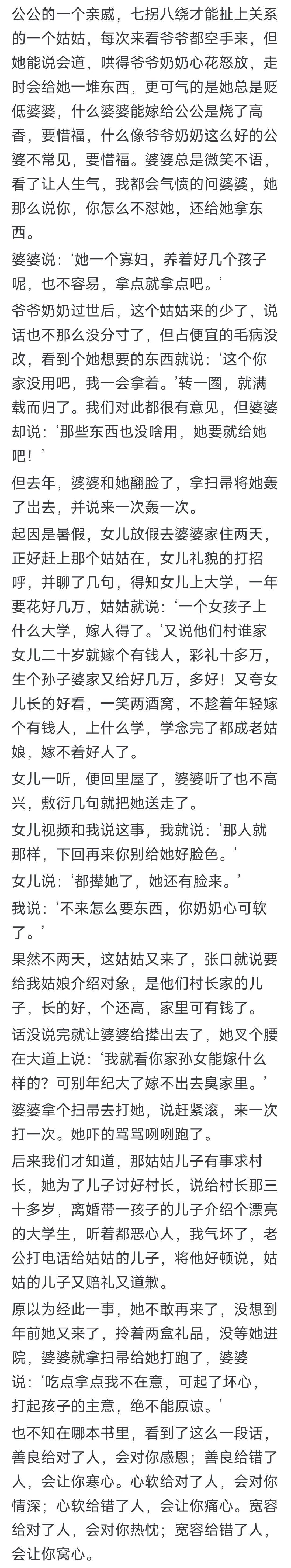 今日聚焦:亲戚的“恶行”究竟能有多离谱?下面,就由小编带着大家一同探寻网友们在这方面的真实经历与深刻感受。 我姐姐远嫁到广州,打那以后,不少亲戚朋友仿佛把我家当成了免费食堂,天天都想着来吃饭、喝酒。其中还有一些人,我压根就不认识。这吃喝方面,花钱倒是小事,可每次吃完饭,那一大堆锅碗瓢盆等着收拾,而大部分活儿都落到了我身上。我之所以一直忍着,主要是心疼我姐姐。我姐夫这人,喝完酒就爱发酒疯,这已经成了家常便饭,而且他发酒疯的时候还常常骂我姐姐。有一次,我实在忍无可忍,直接把桌子抽走,跳起来对着他就是一顿大骂。当时他们家好多亲戚都在场,从那以后,那些亲戚基本不再来我家大吃大喝了。就算偶尔再来,该做饭的做饭,该买东西的买东西,做好之后第一个喊我吃饭。所以啊,只要自己占着理,千万别害怕,就得拿出“发疯”的劲头来,让对方知道你不是好欺负的! 我也有过掀桌子的经历。我爸妈天天吵架,而且每次都是我爸无端挑事,就连在饭桌上也不消停,这让我实在难以忍受。有一次吃饭的时候,他们又吵了起来,我直接“啪”地一声拍了桌子,可这根本没用,我爸还把盘子都推开了。我一气之下,直接把桌子给掀了。那一刻,我内心的压抑彻底爆发,忍不住哭了起来。我本来以为自己这么做是在帮我妈,可没想到,大伯来主持所谓的“公道”时,我妈却在一旁事不关己,像个没事人一样,甚至还在旁边添油加醋,仿佛在看一场热闹。这下好了,我成了受害者,我爸倒成了罪人。后来,我一气之下就走了,也很少回家。就算偶尔回去一次,他们还得看我的脸色,等我走了之后才敢继续吵架。 我小学五年级那年,爷爷去世了。当时我爸我妈刚闹完离婚,还开了庭,我妈躲了起来。我爸抓着我,一路打着我回了老家。到了老家之后,我的三个姑姑连续骂了三天三夜,她们不仅骂我妈,还骂我外公。我外公来了之后,她们竟然骂我外公跟狗一样爬进来,而我也只能像只小狗一样抱着柱子,含着泪听了整整三天。我实在受不了这种屈辱,在出殡前,我一脚把凳子踢到了排位前面。结果,我遭到了一顿打。这件事已经过去30年了,可我始终无法释怀。我恨所有人,恨自己当时为什么没有勇气去砸了那个地方,恨为什么会有这样一个爸爸,恨我妈生下我和弟弟却不保护我们,更恨我爸那边的所有人。如果时光能够倒流,我想我会不顾一切地烧了那里,拿起刀砍死我那几个姑姑,甚至给我死了的爷爷几个巴掌。我真的特别羡慕那些能够勇敢反抗的人,就像前面那位掀桌子的网友,而我当时却只能被动地挨打,什么都做不了。 看完网友们的这些真实分享,相信屏幕前的你们也有满肚子的话想说。欢迎大家在评论区留言,分享你们的故事和看法哦。 |