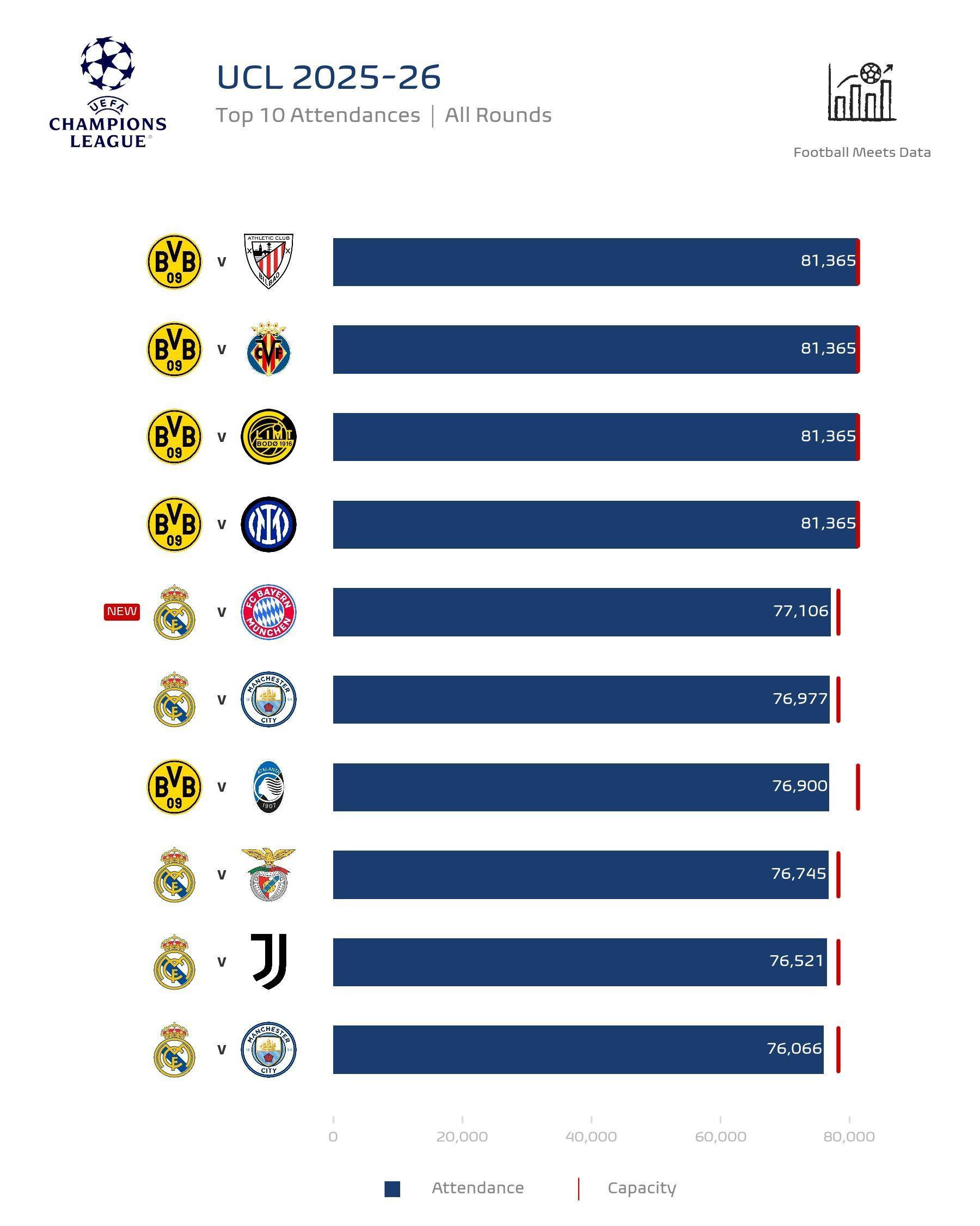 4月9日,权威数据机构Football Meets Data发布了本赛季欧冠联赛的现场观众人数统计榜单。数据显示,德甲劲旅多特蒙德在观众吸引力方面表现尤为突出,不仅包揽了前四名的位置,更是在上座总人数前十的榜单中独占五席。而西甲豪门皇家马德里则占据了剩余五个席位,其中备受瞩目的皇马与拜仁慕尼黑的欧洲德比大战,以77106人的上座人数位列榜单第五。 2025-26赛季欧冠联赛观众人数TOP10详细榜单 81365人 现场见证多特蒙德与毕尔巴鄂竞技的激烈对决 81365人 多特蒙德迎战比利亚雷亚尔,威斯特法伦球场座无虚席 81365人 多特蒙德与博德闪耀的欧冠小组赛吸引满场观众 81365人 国际米兰做客多特蒙德,上座人数再创新高 77106人 皇家马德里与拜仁慕尼黑的巅峰对决引发观赛热潮 76977人 皇马主场迎战曼城,球迷热情高涨 76900人 多特蒙德与亚特兰大的欧冠淘汰赛吸引众多球迷到场 76745人 皇马与本菲卡的较量同样备受关注 76521人 尤文图斯客场挑战皇马,现场观众人数可观 76066人 皇马与曼城的二度交锋依然吸引大量球迷观战 |