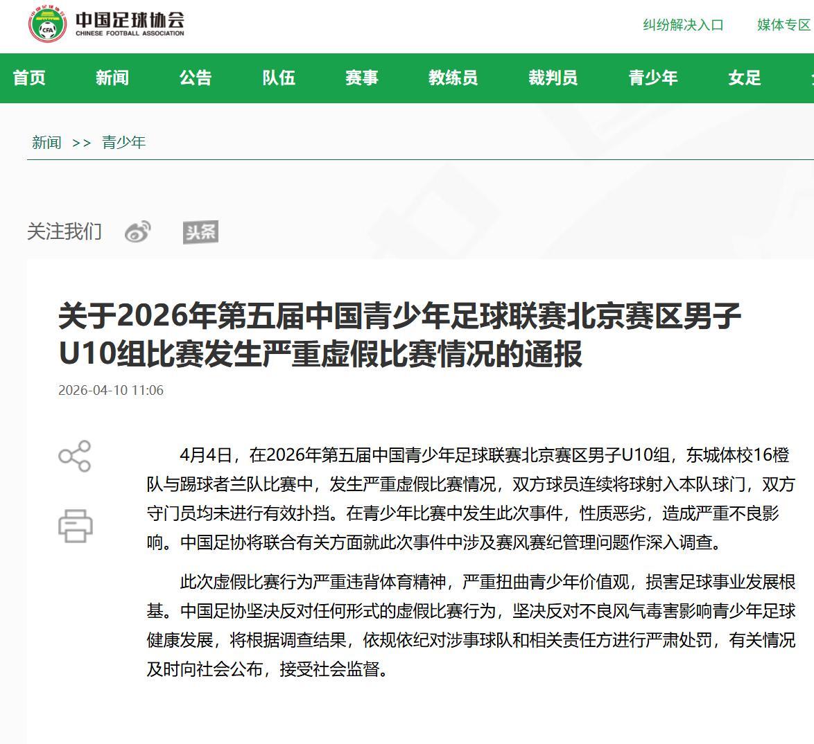 中国足协发布通报:2026年第五届青少年足球联赛北京赛区惊现严重假球事件 4月4日,在2026年第五届中国青少年足球联赛北京赛区男子U10组别的一场焦点对决中,东城体校16橙队与踢球者兰队之间上演了一场令人瞠目结舌的假球闹剧。比赛中,双方球员竟连续将球踢入自家球门,而双方的守门员也仿佛事先约定好一般,均未做出任何有效的扑救动作。这样一场在青少年足球赛场上极为罕见的假球事件,不仅性质恶劣,更在社会上造成了极其不良的影响。针对此事件,中国足协已明确表示,将联合相关部门对此次事件中涉及的赛风赛纪管理问题进行全面而深入的调查。 此次假球行为不仅严重违背了体育竞技的公平、公正原则,更对青少年的价值观产生了极大的扭曲作用,对足球事业的健康发展构成了严重威胁。中国足协对此类行为持零容忍态度,坚决反对任何形式的虚假比赛,以及不良风气对青少年足球的侵蚀。足协方面表示,将根据调查结果,严格按照相关规定和纪律,对涉事球队及相关责任方进行严肃处理,并将处理情况及时向社会公布,以接受广大球迷和社会的监督。 (信息来源:中国足协官方网站) |
