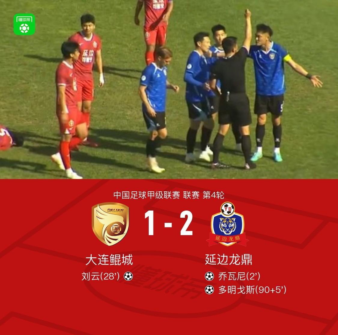 北京时间4月12日,中国足球甲级联赛第4轮赛事激战正酣,大连鲲城坐镇主场迎战来访的延边龙鼎。在这场备受瞩目的对决中,大连鲲城的刘云率先打破僵局,而延边龙鼎则凭借乔瓦尼和多明戈斯的出色发挥,最终以2-1的比分逆转取胜。 关键赛事回顾 比赛伊始,仅第2分钟,延边龙鼎便展现出强大的进攻火力。多明戈斯精准传球,乔瓦尼接球后内切兜射,皮球直窜近角,延边龙鼎1-0领先,为比赛奠定了基调。 然而,大连鲲城并未因此气馁。第28分钟,吴彦澍在右路送出斜传,刘云后点敏锐捕捉战机,推射破门,将比分扳平为1-1,双方重回同一起跑线。 比赛进入伤停补时阶段,第90+5分钟,延边龙鼎再次发起猛攻。孙锡鹏送出精妙助攻,多明戈斯兜射破门,完成绝杀,延边龙鼎2-1锁定胜局。