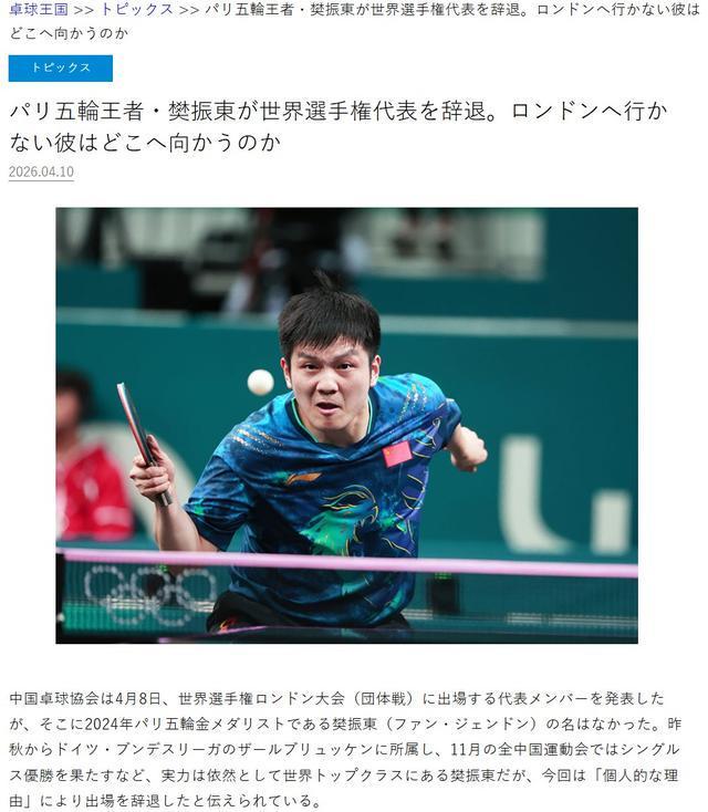 近期,日本知名乒乓球专业媒体《卓球王国》发表了一篇引人关注的文章,标题为《巴黎奥运冠军樊振东未入选世锦赛名单,缺席伦敦的他未来何去何从?》
