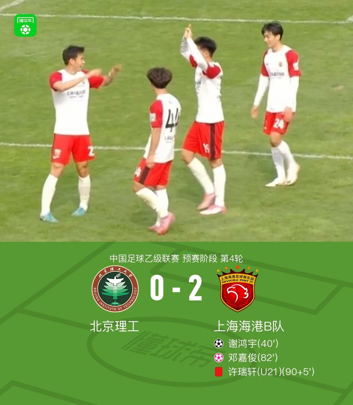 在4月14日进行的中国足球乙级联赛预赛阶段第4轮的一场焦点对决中,北京理工坐镇主场迎战上海海港B队。比赛过程中,北京理工的邓嘉俊不慎自摆乌龙,而上海海港B队的谢鸿宇则抓住机会破门得分。最终,全场比赛以北京理工0-2不敌上海海港B队告终。 本场关键事件回顾 比赛进行到第40分钟时,张俊杰精准吊传禁区,谢鸿宇接球后停球射门动作连贯,一气呵成,帮助海港B队率先打破僵局,1-0领先。 第82分钟,场上风云突变,北京理工的邓嘉俊在解围时出现严重失误,不慎将球踢入自家球门,海港B队借此机会将比分扩大至2-0。 比赛进入伤停补时阶段,第90+5分钟时,北京理工的徐瑞轩因暴力行为被裁判直接出示红牌罚下,为这场比赛增添了一抹戏剧性。
