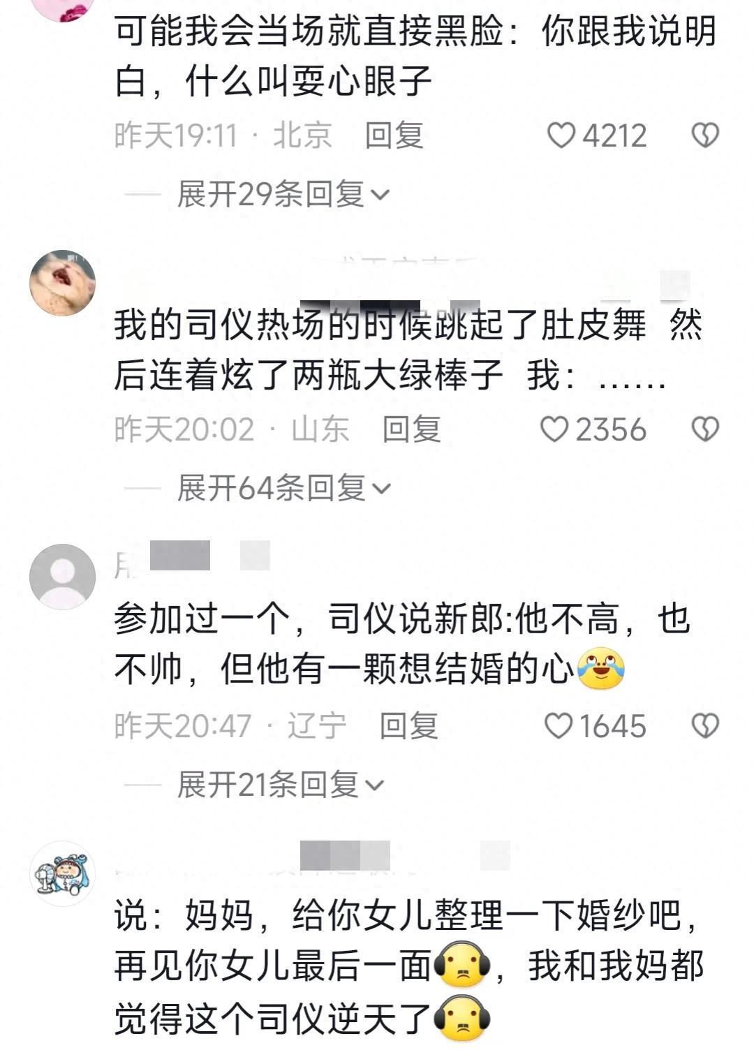 今日聚焦:婚礼司仪那些让人哭笑不得的“神操作”,你遇到过吗?今天,徽声在线的小编就带大家一同揭秘,网友们分享的那些婚礼司仪的“精彩瞬间”。 有网友爆料,在一场婚礼上,男司仪竟然公然开新娘的黄色笑话,场面一度十分尴尬。新郎面无表情地走过去,一巴掌扇在司仪脸上,夺过麦克风冷冷地说:“滚下去,你这脏东西。”司仪震惊不已,新娘也怒不可遏,反手给了司仪另一边脸一巴掌,怒斥道:“你妈才像你说的那样,给不知道多少男的睡了!”最终,婚礼策划公司为了平息风波,给这对新人免了单。 还有一场婚礼,让参加过的宾客都记忆犹新。原本婚礼仪式30-40分钟最为适宜,可这场婚礼却硬生生拖到了80分钟。宾客们下班后匆匆赶来,桌上却只有几道前菜,还是晚宴!大家饿得前胸贴后背,却只能听着文绉绉的誓言和“唯美”的成语。六点半开始的仪式,七点半还没能吃上饭,有人已经开始离场。等终于拿到筷子时,已经走了三分之一的人。敬酒过程中又走了一半,敬完酒本应是热闹吃喝的时候,却已经没几桌人了。虽然理解这是新人想要的仪式感,但完全不顾及宾客的感受,实在有些欠妥。 我堂姐结婚时,有个环节是堂姐的爸爸,也就是我的姑父上台。这时,司仪说了句:“女儿是爸爸的前世小情人。”懂这个梗的人,脸色瞬间就变了,比如我。后来,我姑妈也上去了,司仪又说了句:“祝愿你们的婚姻和父母一样幸福。”当时,我们这一桌的人脸色都不好看,因为大家都知道,我姑父和姑妈已经离婚了。 我结婚前,特意交代司仪不要太伤感,也不要开黄色玩笑。结果婚礼上,他还是问我:“新郎打不打呼噜?”我当时在台上紧张得要命,脑子没反应过来,下意识就说:“不打呼噜。”然后司仪就笑着说:“哦~看来新娘早就知道啊!”台下坐着一帮亲戚,我尴尬得要命。后来,我对象表妹的朋友结婚,也找了这家司仪。他们吸取了我的教训,特意交代司仪不要开这种问题。结果婚礼当天,司仪还是一样的话术。我都怀疑这些司仪是不是根本不会临场发挥或者提前准备,对所有婚礼都是一套话术应付了事。 我姐结婚时,男方请了他家远门亲戚大伯做司仪。他们接亲迟到了半个钟,那个司仪就一直催我们女方这边不要有流程了,说我们耽误吉时,直接接了就走。我们没理他。吃席的时候,他自己拿瓶啤酒敬我爸,非要我爸用一杯白酒回他。他们装白酒的杯子还不是小玻璃杯,是大杯的玻璃杯,整整半杯!他非要我爸干了,不喝就是看不起他。这司仪,真是让人无语。 看完网友们的这些分享,你是不是也有一肚子的话想说?欢迎在评论区留言,一起聊聊你遇到的那些婚礼司仪的“神操作”! |