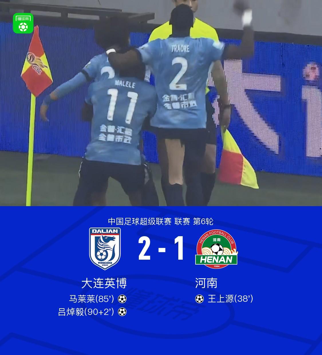 4月18日,中国足球超级联赛第6轮赛事激战正酣,大连英博坐镇主场迎战河南队。在这场焦点对决中,大连英博的马莱莱与吕焯毅联手发威,分别建功,而河南队则由王上源攻入一球。最终,大连英博以2-1的比分逆转战胜河南,豪取四连胜。