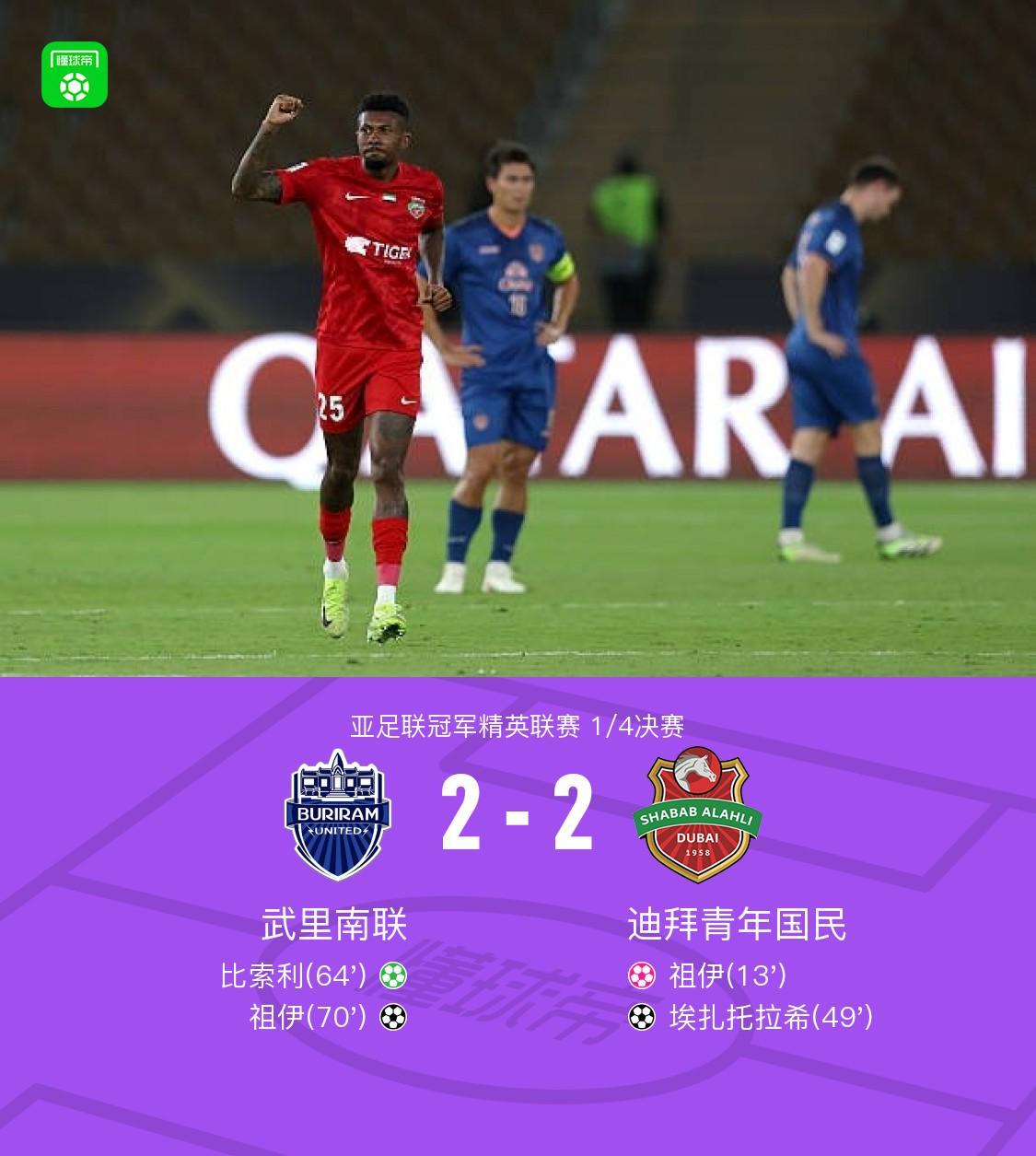 北京时间4月19日,在亚足联冠军精英联赛1/4决赛的激烈角逐中,武里南联与迪拜青年国民展开了一场势均力敌的较量。上半场,武里南联的祖伊不慎自摆乌龙,为对手送上大礼。下半场风云突变,埃扎托拉希头球建功,将比分扩大为两球优势。然而,武里南联并未放弃,比索利抓住机会点射破门,随后祖伊也将功补过,攻入一球。最终,双方在90分钟内战成2-2平,比赛不得不进入加时赛来决定胜负。 关键赛事回顾 比赛进行到第13分钟,场上出现意外,武里南联的祖伊在防守时不慎将球碰入自家球门,武里南联0-1暂时落后于迪拜青年国民。 第49分钟,迪拜青年国民抓住机会,埃扎托拉希利用头球攻门得手,武里南联0-2陷入更加被动的局面。 第63分钟,场上形势发生转折,埃扎托拉希在禁区内手球犯规,裁判果断判罚点球。比索利冷静主罚,一蹴而就,武里南联1-2扳回一城。 第70分钟,祖伊终于找到救赎的机会,他成功破门,将比分扳平为2-2,武里南联重燃希望。