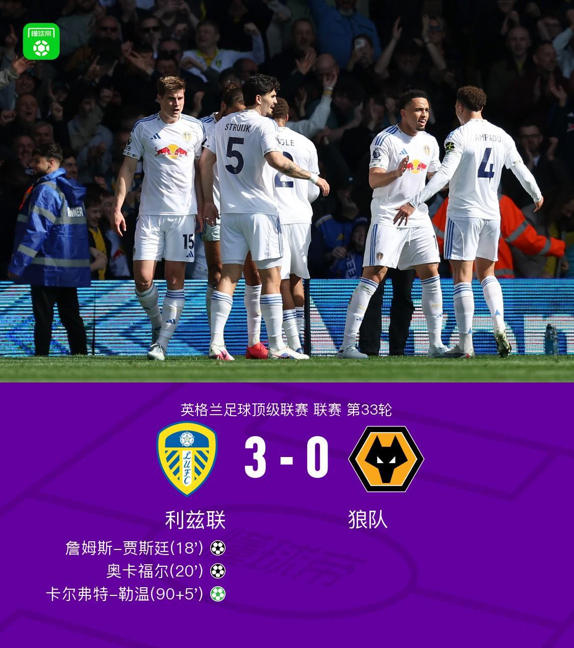 北京时间4月18日晚,英格兰足球顶级联赛第33轮迎来一场焦点对决,利兹联坐镇主场迎战狼队。比赛开场阶段便高潮迭起,詹姆斯-贾斯廷以一记精彩绝伦的倒钩射门为利兹联首开纪录,随后奥卡福尔接队友精准传中,冷静推射得手,完成传射建功的壮举。比赛尾声,卡尔弗特-勒温点球命中,为利兹联锁定胜局。最终,利兹联以3-0的比分完胜狼队,延续五轮不败的强势表现。 比赛关键节点回顾 第18分钟,利兹联禁区内上演倒钩接力好戏,贾斯廷凌空倒钩破门,利兹联1-0取得领先 第19分钟,奇迹时刻!仅仅一分钟后,阿伦森送出美妙弧线球传中,奥卡福尔拍马赶到,轻松推射破门,利兹联迅速扩大领先优势至两球 第90+4分钟,勒温在禁区内被对手放倒,他亲自操刀主罚点球,一蹴而就,利兹联3-0领先,彻底杀死比赛悬念