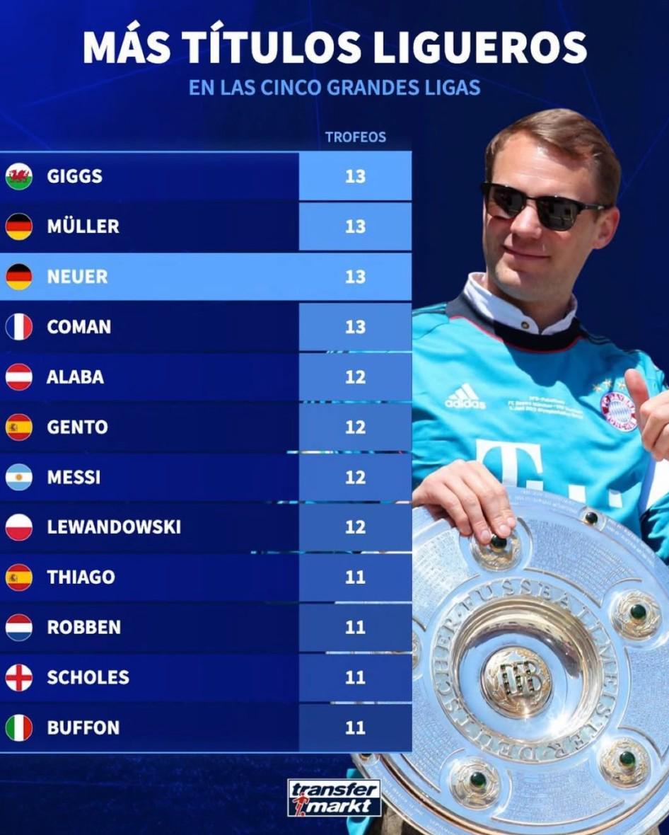 北京时间4月21日,随着拜仁慕尼黑队再度成功卫冕本赛季德甲联赛冠军,权威数据统计机构德转(Transfermarkt)及时更新了欧洲五大联赛球员夺冠次数的排行榜。在这份备受瞩目的榜单中,拜仁门神诺伊尔凭借其出色的表现,以13次夺冠的辉煌成就,与曼联传奇吉格斯、现队友托马斯-穆勒以及金斯利-科曼并肩,共同占据历史第一的宝座。 德转最新五大联赛球员夺冠次数详细榜单: 1. 吉格斯(曼联传奇) - 13次 1. 托马斯-穆勒(拜仁慕尼黑现役球员) - 13次 1. 诺伊尔(拜仁慕尼黑门将) - 13次 1. 金斯利-科曼(拜仁慕尼黑边锋) - 13次 5. 阿拉巴(前拜仁球员,现效力于其他豪门) - 12次 5. 亨托(皇马传奇) - 12次 5. 梅西(巴萨及现效力球队传奇) - 12次 5. 莱万多夫斯基(前拜仁球员,现转会至其他联赛) - 12次 9. 蒂亚戈(前拜仁中场,现效力于其他联赛) - 11次 9. 罗本(前拜仁边锋,已退役) - 11次 9. 斯科尔斯(曼联传奇中场) - 11次 9. 布冯(尤文图斯及意大利国家队传奇门将) - 11次 |