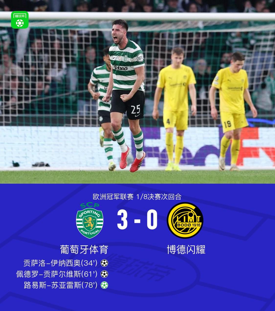 北京时间3月18日,欧洲冠军联赛1/8决赛次回合迎来一场焦点对决,葡萄牙体育坐镇主场迎战博德闪耀。上半场,葡萄牙体育展现出强大的进攻火力,贡萨洛-伊纳西奥利用角球机会头球破门,为球队首开纪录。随后,佩德罗-贡萨尔维斯在苏亚雷斯的精妙助攻下,抢点成功再下一城。比赛临近尾声时,路易斯-苏亚雷斯亲自操刀点球命中,将总比分扳平。最终,葡萄牙体育以3-0的比分完胜本场,但两回合总比分定格在3-3,双方不得不进入加时赛决一胜负。 关键事件回顾 第34分钟,葡萄牙体育获得角球机会,贡萨洛-伊纳西奥高高跃起,一记精准的头球攻门,皮球直窜网窝,葡萄牙体育1-0领先博德闪耀。 第61分钟,苏亚雷斯送出妙传,贡萨尔维斯心领神会,快速插上抢点破门,葡萄牙体育将比分扩大至2-0。 第77分钟,博德闪耀球员费特在禁区内不慎手球犯规,裁判果断判罚点球。苏亚雷斯冷静主罚,一蹴而就,将总比分扳成3-3平。