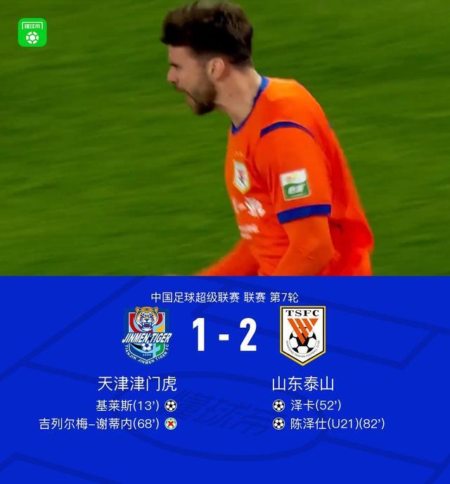 4月21日,中国足球超级联赛第7轮迎来一场焦点对决,天津津门虎坐镇主场迎战山东泰山。本场比赛跌宕起伏,基莱斯为津门虎首开纪录,谢蒂内送出助攻却错失点球良机,泽卡头槌建功并击中门框,陈泽仕终场前完成绝杀,最终山东泰山客场2-1逆转战胜天津津门虎。