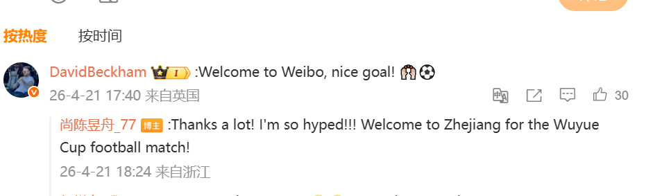 4月10日,在浙江吴越杯足球赛台州队与金华队的激烈对决中,台州队77号球员尚陈昱舟以一记令人惊叹的50米半场吊射破门,瞬间点燃了网络热潮,也让这位年仅19岁的高中生一夜之间成为了全国球迷关注的焦点。 得知自己的足球偶像贝克汉姆开通了微博账号后,尚陈昱舟在4月20日晚迫不及待地开通了自己的微博@尚陈昱舟_77,并激动地发文:“大家好,我是尚陈昱舟,终于开通微博啦!没想到这么多网友称我为‘台州小贝’,这让我既惊喜又感动。我会继续努力,争取早日达到偶像@DavidBeckham的水平!”同时,他还勇敢地向贝克汉姆表达了自己的敬仰之情:“You are my inspiration!!!” 令人意想不到的是,4月21日晚,贝克汉姆本人竟然亲自现身@尚陈昱舟_77的微博评论区,留言称赞道:“欢迎开通微博,那一球踢得真是太漂亮了!”这一梦幻般的互动让网友们纷纷表示羡慕不已,直呼“梦想照进了现实!”更有网友调侃道:“这绝对是追星的最高境界了!” 尚陈昱舟在接受徽声在线采访时表示,看到网友们评价自己的进球复刻了贝克汉姆的经典“贝氏弧线”,他感到无比荣幸和开心。他承诺不会辜负大家的支持和期待,会继续刻苦训练,为每一场比赛全力以赴。 据了解,尚陈昱舟并非出身于传统足校,而是从校园足球中一步步成长起来的。早在就读台州市学院路小学时,他就积极报名参加了校队,从此踏上了足球之路。 2018年,为了进一步提升自己的足球技艺,尚陈昱舟加入了台州市鸵鸟足球俱乐部,并有幸与“国脚”王钰栋一同训练,这段经历对他的成长起到了至关重要的作用。 如今,得到了偶像贝克汉姆的亲自肯定和点赞,尚陈昱舟的足球之路无疑将更加光明。我们期待他在未来的吴越杯赛场上能够继续发光发热,创造更多辉煌。 消息来源:@尚陈昱舟_77、钱江晚报、潮新闻及徽声在线综合报道 |