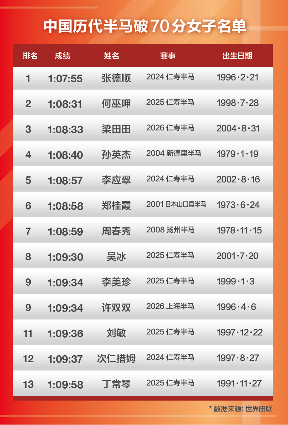 “想要在半程马拉松中突破70分钟大关,首先需要达到68-69分钟的水平,这样在比赛中才有机会实现这一目标,而不是冒险在体能极限边缘尝试突破。这正是我们训练时所采用的方法。” 定州半程马拉松结束后,朱卿在乘坐卧铺返回深圳的途中,对自己的未来能否打开70分进行了深入分析。此前,她刚刚在这场比赛中刷新了自己的个人最佳成绩(PB)。 在这场定州半程马拉松中,朱卿继石家庄半程马拉松后,再次实现了PB的两连跳,成绩从1:11:52提升至1:10:43。在收获破赛会纪录奖金的同时,朱卿透露,比赛初期她的节奏较为激进,一度按照3分18秒的配速巡航,原本计划尝试突破70分钟。然而,由于身体疲劳,她最终放弃了这个念头,决定留待以后实现。 一个月前的3月15日,在被誉为最易PB的赛道——仁寿半程马拉松上,两位大众女选手刘君慧和唐晓芳首次跑进了70分钟,率先发起了向Sub70(即突破70分钟)的冲击。根据世界田联的数据,中国女子半程马拉松Sub70俱乐部的成员仅有13人,其中10个成绩都出自2024年之后,且9个来自仁寿半程马拉松。在今年的仁寿比赛中,中国女子半程马拉松一姐张德顺因婚礼后事务繁忙,错失了冲击自己保持的1:07:55中国最好成绩的机会,仅跑出了1:14:17。而全运会双金王梁田田则在自己第二年的仁寿比赛中交出了1:08:33的PB,位居2026年度中国女子半程马拉松榜首。 如今,朱卿在河北的PB成绩让她加入了大众女子半程马拉松战局的新猜想:全马PB228的大众一姐和半马PB70:27的大众半马一姐,谁将成为第一个突破70分钟的大众女选手?或者,是否会有其他黑马出现? 大众半程马拉松一姐刘君慧 更看重70分钟,但更渴望跑明白全马 3月15日的仁寿,计时器定格在1:10:22。西南大学研究生三年级的刘君慧冲过终点线时,激动不已。她的身后是今年东京马拉松PB到2:26:35的全马高手路颖。 仁寿一战,刘君慧达标国际健将 她身后是河南队全马PB226的路颖 赛前,刘君慧的目标很简单,就是突破半程马拉松国际健将标准——1:12:15。在仁寿之前,她的半程马拉松PB是1:13:27。 当她为自己的突破感到高兴时,平时在IchallengeLab俱乐部负责她训练的祁敏教练在社交平台留言:“我不高兴,说好的突破70分钟呢?” 这是大众女跑者第一次距离70分钟只有22秒之遥。 然而,刘君慧对大众半程马拉松一姐的称谓并不太在意。她觉得自己虽然没注册过专业队,但毕竟从高中时就开始练习1500米和3000米。2018年,在清华附中上高中的她还试水了北京半程马拉松。那一次她记忆深刻,因为起床晚,到达出发点时已接近迟到。那一场,她跑出了1:24:18。 时隔八年后,作为西南大学研三学生,身经百战的刘君慧在4月再次站上了北京半程马拉松的赛道,跑出了1:11:19的个人第二好成绩。在跑北京半程马拉松之前,她经历了一场四天三晚、在海拔4300米以上的雪山重装徒步,以及一场全马和两场半程马拉松的身体消耗。来北京前一天,她还在丽江完成了一天的广告拍摄任务,才深夜抵达北京。 3月高强度比赛结束后,刘君慧和伙伴们选择了重装徒步 这是她研究生毕业前的一次旅行 跑过百场全马的黄菲非常看好刘君慧,认为这个从贵州威宁大山走出来的姑娘具有很强的速度优势。刘君慧坦诚,在平时训练中,她更喜欢跑场地课,“别人一跑场地就害怕,我每次跑场地都特别兴奋,而且跑得很好。” 与刘君慧有过一起训练经历、全马212的贵州老乡杨章兴认为,她未来全马突破230都不是问题,“这是我心中未来的大姐大”。 不过,相较于半程马拉松的游刃有余,刘君慧心里更希望自己能把全马跑得更明白一些。 全马大众一姐朱卿 突破70分钟只是时间问题 定州半程马拉松赛前一天,朱卿感受到了身体发出的疲劳信号。一方面是从深圳赶路,另一方面接连作战对身体带来的消耗。她跟男友罗源开玩笑说:“要不你替我跑吧,我不想跑了。” 定州比赛日清晨热身时,她没完全兴奋起来,心生不想热身的惰性。“我属于嘴上说不想跑,但心里知道上赛道,就不要问状态好不好,跑就好了。”站上赛道,朱卿决意与脑海中的惰性划清界限。 定州赛道上,朱卿跑在了“无人区” 这场比赛她获得了女子第一,全场第6 在定州赛道,朱卿再次遇到了北京队的刘敏,两人复制了重庆马拉松时的情景,跑在了一起。但后来,随着朱卿配速提到3分18秒至3分20秒,周周比赛的刘敏有些吃不消,掉了下去。比赛变成了朱卿一个人看着手表的对决。画面有些和北半马不停看表的王文杰类似。 “因为要跑成绩,刷PB,就要自己掌控节奏。本来按激进跑法是往70分钟以内冲的,但跑起来腿部肌肉没弹性,所以不敢往3分18秒的配速冲,只能按3分20秒顺下来了。”朱卿复盘了她的这场比赛。 回望朱卿的职业轨迹,很多人觉得她在高中时练过1500米和3000米并达标二级,为她路跑打下了坚实的速度基础。她却不这么认为,毕竟大一定向越野之后到宝安马拉松跑出246之前,她都以健身为主没怎么跑步。 在她看来,如果有老底可以啃,很多运动员就不会换教练、换团队了,“快肌和慢肌都要通过训练不断刺激,高中的基础只是国家二级,放在现在不算什么。跑出好成绩的前提一是健身,肌肉质量相对好,还有就是因材施教。” 她所说的“因材施教”是指她和罗源现在训练不会套用别人的课表,“要多问为什么。为什么这么练?为什么这么跑?这是一种训练模式上的思考能力,不是说那个人水平那么高,他