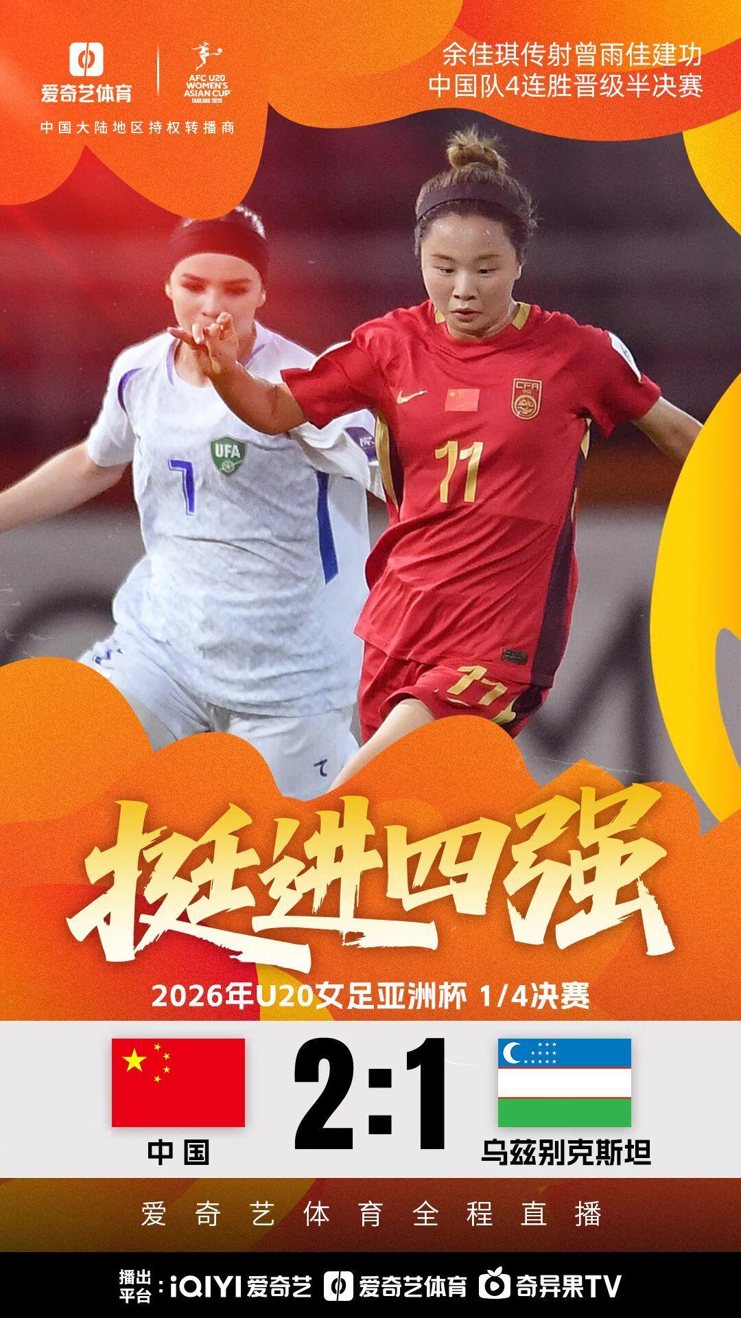 在4月11日晚间进行的U20女足亚洲杯1/4决赛中,中国U20女足与乌兹别克斯坦U20女足展开了一场激烈角逐。这场比赛吸引了众多球迷的目光,大家都期待着中国女足能在这场关键战役中取得佳绩。 比赛上半场,局势对中国女足十分有利。余佳琪展现出了出色的传球能力,她精准的传中,为曾雨佳创造了绝佳的进攻机会。曾雨佳抓住时机,头球破门,为中国女足先下一城。紧接着,余佳琪又获得射门机会,对方门将出现脱手失误,这一意外情况让中国女足再次获得得分良机,进一步扩大了领先优势。 然而,下半场风云突变。乌兹别克斯坦女足的埃甘别尔季耶娃抓住门前抢点的机会,成功破门,为球队扳回一城。这一进球让比赛的局势变得紧张起来,双方都全力以赴,争取最后的胜利。最终,经过激烈的较量,U20中国女足凭借上半场建立的优势,以2 - 1的比分战胜了乌兹女足U20,成功晋级4强。值得一提的是,此次晋级意味着球队时隔8年再次获得世青赛的参赛资格,这对于中国女足来说意义重大。 根据赛程安排,北京时间4月15日21点,U20女足亚洲杯半决赛将迎来一场焦点之战——中日对决。这场比赛备受瞩目,届时徽声在线旗下的爱奇艺体育将全程直播,广大球迷可以通过该平台观看这场精彩赛事,共同为中国女足加油助威。 |