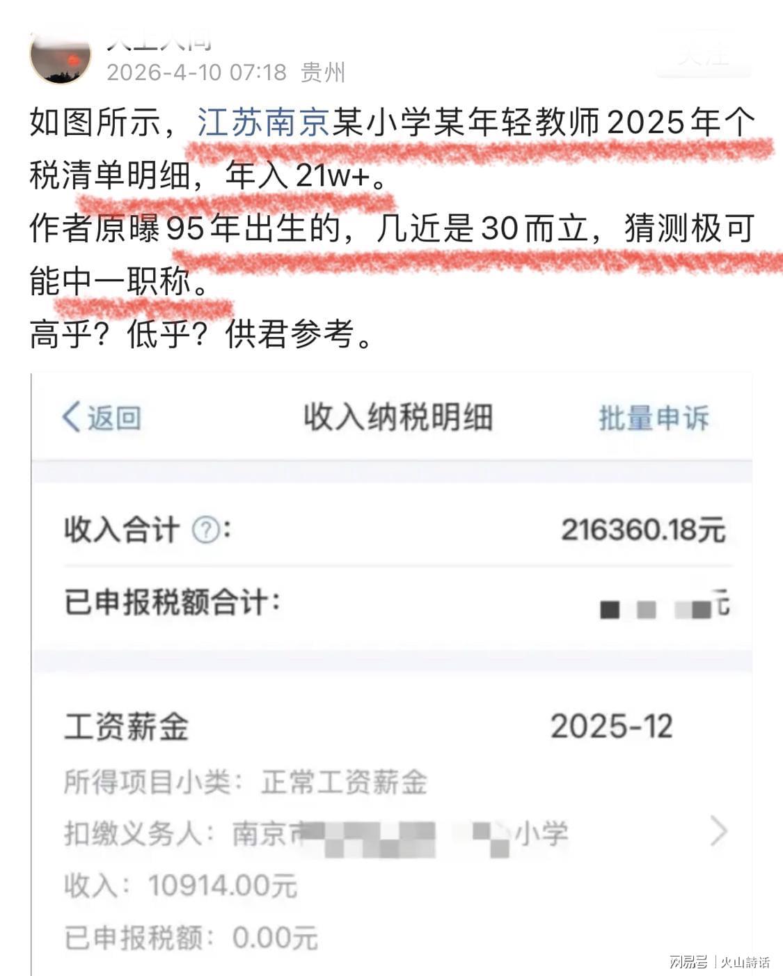 近日,一则关于南京某小学教师个税清单的消息在网络上掀起了轩然大波。一位95后教师成功获评中级职称(中一),其公布的年收入超过21万元,这一数字瞬间引发了网友们的广泛讨论,关于其收入“偏高”还是“偏低”的争论不绝于耳。 据徽声在线网友的爆料,一份江苏南京某小学年轻教师的2025年个税清单明细被曝光,年收入高达21万多元。爆料者透露,这位教师出生于1995年,即将步入而立之年,因此推测其很可能已经获得了中级职称。这一收入水平究竟是高是低?引发了网友们的热烈讨论。 根据网友提供的个税后台数据截图,这位小学教师在2025年的全年收入确实达到了216360.18元。这一数字无疑让不少人感到惊讶,也进一步加剧了关于教师收入的讨论。 针对这一事件,有网友评论称,21万的年收入至少达到了事业单位的六档水平。对于一位95后的年轻教师来说,能够达到九档就已经相当不错了。这一观点引发了不少人的共鸣。 也有网友引用诗句“数风流人物,还看今朝”来表达对这位年轻教师的赞赏,认为其收入水平与其能力相匹配。 不过,也有网友提出了不同的看法。他们分析认为,个税上的收入并不仅仅包括工资收入,还可能包括稿费、劳务费、自媒体收入等非工资性收入。因此,不能单纯地以个税收入来评判教师的实际收入水平。