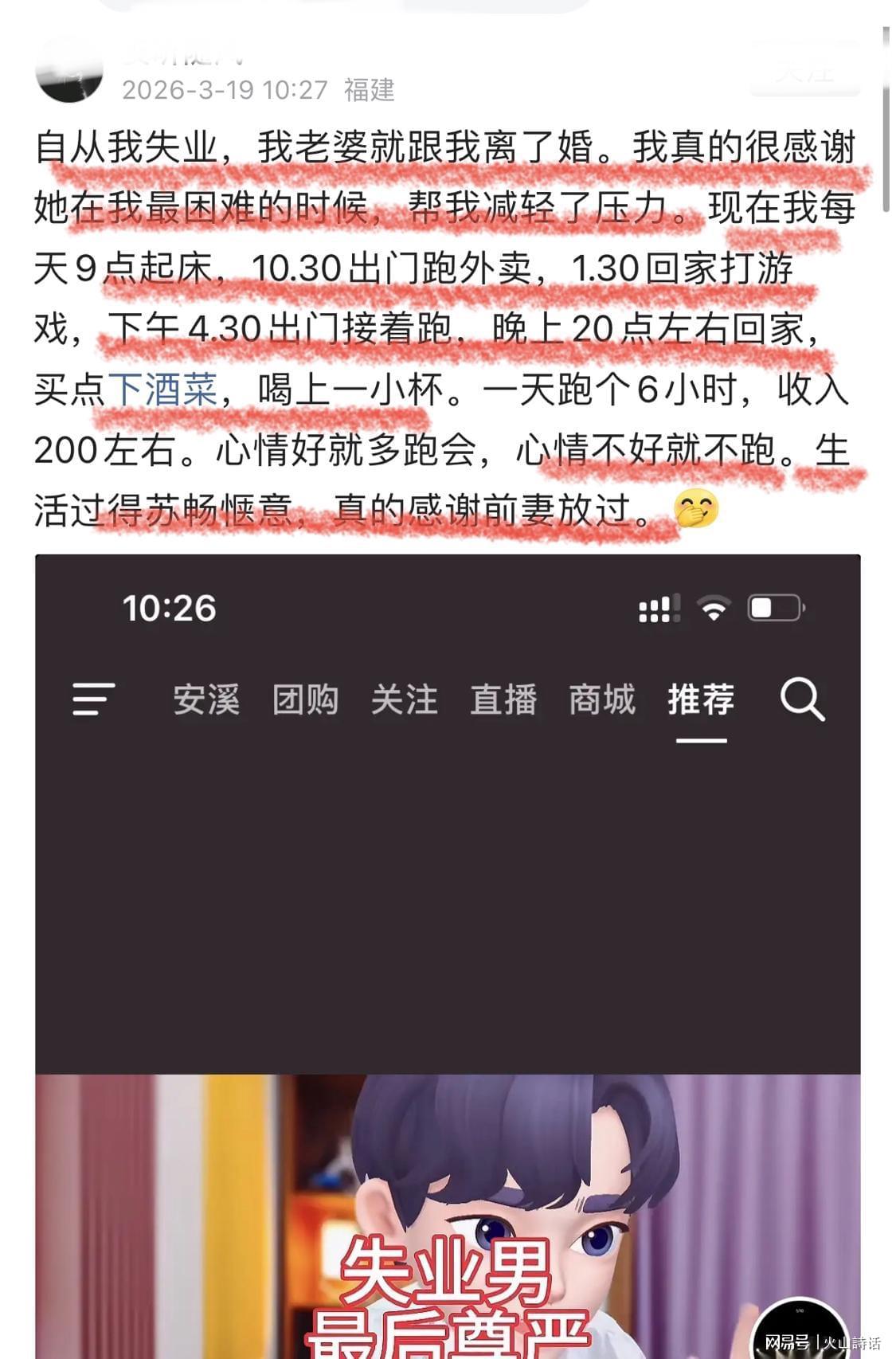 自从我遭遇失业的困境,妻子便选择与我结束了婚姻关系。出乎意料的是,我内心竟对她充满了感激,因为在那个艰难的时刻,她的离开似乎也为我卸下了一份沉重的负担。 近日,一位来自福建安溪的网友在网络上分享了自己的近况。他表示,现在每天的生活节奏变得轻松而自在:9点悠然起床,10点半出门送外卖,1点半回家享受游戏时光,下午4点半再次出发,晚上8点左右归来,还会顺道买些下酒菜,小酌一杯。每天工作大约6小时,收入稳定在200元左右。心情好的时候就多跑一会儿,心情不佳则选择休息。 这位网友坦言,如今的生活状态让他感到前所未有的舒畅与惬意,他真心感谢前妻的“放手”。 此帖迅速在网络上引发了广泛讨论。有网友留言道:“我也是失业后就被离婚了,现在回到老家,没有房贷车贷的压力,父母退休金加起来近万,我直接选择了躺平啃老,这日子过得真舒坦!” 另一位网友则分享了自己的经历:“自从我们夫妻店的生意下滑,我老婆就开始独自摆夜摊。我一个人守着店铺,晚上还得去帮她,后来她生意越来越好,反而开始嫌弃我了。离婚时,我一分钱都没要,全留给了她。现在我一个人开店,晚上不用再帮她,就跑去送外卖,两年下来存了点钱,还买了辆车晚上跑网约,白天继续开店。谁离了谁,日子都能过下去。” 还有网友从更深层次的角度进行了思考:“这个世界离开谁都能继续运转,但老祖宗可是花了几千年的时间才把男人与婚姻、责任紧密相连。如果没有婚姻和责任的束缚,男人花钱的能力绝对会远超赚钱的能力。这个问题,不知道女人们有没有想过?特别是当男人陷入困境时,也许只是因为肩上的责任太重,而非真的养不活自己。”