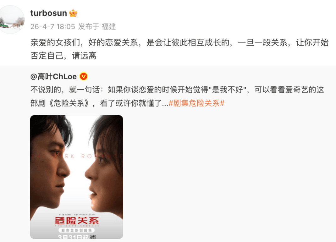 ![]() 徽声在线消息,4月7日当天,演员高叶在社交平台为好友孙俪的新剧《危险关系》展开宣传。她发文表示:“暂且不论其他,仅想分享一句:当你在恋爱中频繁产生‘是不是我不够好’的自我怀疑时,不妨打开爱奇艺观看这部剧集,或许能从中找到答案..” 针对高叶的暖心推荐,孙俪随后回应道:“致所有正在经历情感困惑的女孩们,真正健康的恋爱关系应当是双向赋能的成长型关系。如果某段感情持续消耗你的自信,让你不断否定自我价值,请务必及时止损,勇敢离开。” |