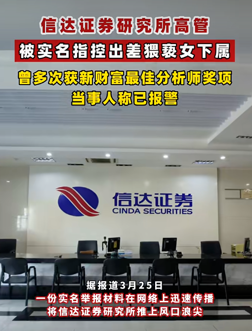 近日,金融行业再度掀起轩然大波,一则涉及信达证券研究所所长的丑闻引发广泛关注。此次事件的主角是信达证券研究所所长左某某,被其女下属唐某某实名举报猥亵。