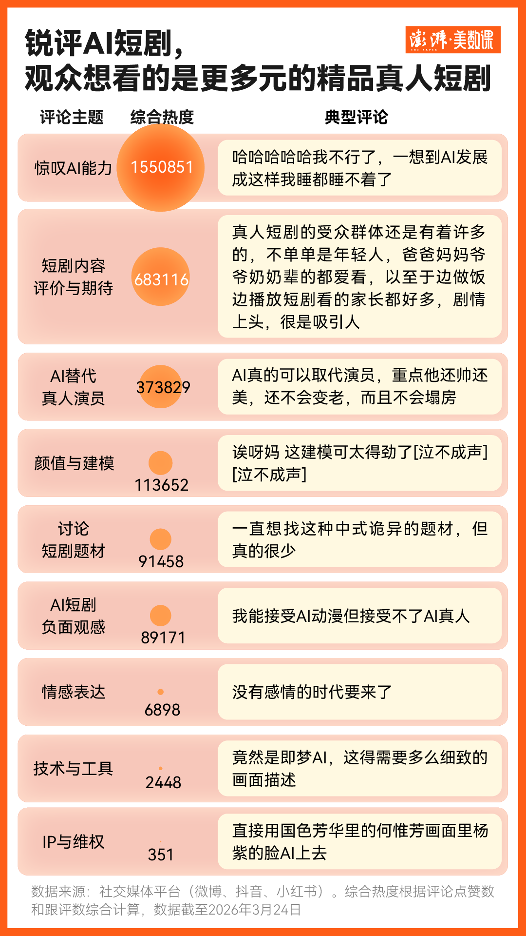 近日,微博热搜榜上#男二以下演员用AI#的话题引发了广泛讨论,关于AI是否会取代真人演员的争议甚嚣尘上。就在该话题登上热搜榜首的当天,影视公司耀客传媒宣布签约两位AI数字艺人,这一举动似乎进一步加剧了人们对AI替代真人演员的担忧。 然而,从短剧市场、平台运营以及观众反馈来看,对高质量真人实拍剧的需求并未减少,反而呈现出增长态势。在2026中国电视剧制作产业大会上,红果短剧总编辑乐力透露,2026年红果将在内容创新与进阶发展上加大投入,预计全年内容总投入预算将增长超过40%,对真人短剧的投入力度也将持续加大。 徽声在线美数课工作室通过深入分析3.6万条与“AI短剧”“AI演员”相关的社交媒体评论后发现,网友们并未将“AI替代真人演员”作为讨论的核心议题。相反,他们更关注短剧行业的未来发展,期待看到更新颖的题材、更精湛的演技以及更精良的制作。这些需求恰恰表明,在AI技术日益渗透影视行业的背景下,短剧的“人感”正变得愈发重要。 AI短剧引发热议,但替代焦虑并非主流声音 自#男二以下演员用AI#话题登上热搜后,舆论场上对AI替代真人演员的焦虑情绪被迅速放大。然而,从更广泛的社交媒体平台来看,网友对AI短剧的讨论议题更为多元,替代真人并非他们关注的焦点。 徽声在线采用BERTopic主题聚类方法,对多个社交媒体平台上网友对AI短剧的评论进行了聚合分析,共归纳出9个主要议题。从评论点赞数和跟评数量来看,综合热度最高的议题是“惊叹AI能力”,其次是“探讨短剧内容”,而“AI替代真人演员”仅排在第三位。 那么,普通人对AI短剧的接受度究竟如何呢?从评论中可以看出,部分网友在评价AI替代真人演员时,也流露出了一定的职业焦虑。有网友表示:“希望发布视频的作者能明确说明这个视频虽然是AI制作的,但背后需要很多条件和技术支持。否则,我担心老板看到后会要求我们这些3000块的设计师也制作出同等水平的作品来给客户,那我的工作可就岌岌可危了。” 与此同时,大量网友对AI为短剧带来的更广阔题材表达空间充满期待。他们认为,AI非常适合创作仙侠、恐怖、烧脑等类型的剧情,甚至主动推荐适合AI二创的作品。还有网友表示,AI在视效方面的能力可以将以往只有大成本制作才能实现的特效场景引入到短剧中,从而丰富短剧的整体视觉效果。 从影视发展史的角度来看,竖屏短剧只是媒介形式的一种演变,观众的本质需求并未发生改变。动漫与真人剧一直并存发展,随着AI技术的不断进步,视频故事市场将吸引更多观众。观众对于好题材、好故事的期待不会因AI技术的发展而减弱。 从“追热点”到“建谱系”,短剧以新题材开拓新市场 观众对短剧题材多元化的期待已经被平台和承制方精准捕捉。红果短剧总编辑乐力在2026中国电视剧制作产业大会上表示,红果平台上的核心高热题材数量已从19个扩充至36个,题材池的横向拓展已初具规模。题材数量的增长标志着微短剧内容供给从“追热点”向“建谱系”的转变。 据徽声在线观察,今年春季红果上新的多部待播剧中,一些新题材成为了预约热剧。例如,主打商战的《流星》预约量突破360万,主打动作戏的《隐身侍卫2》预约量突破300万。这些高预约量的短剧中,大多数都是真人实拍剧。 从热度来看,目前抖音平台上的头部热播短剧仍以真人实拍剧为主,但AI短剧也展现出了强劲的增长势头。数据显示,抖音热播榜TOP100中,漫剧的占比从2025年9月至今的半年内由1%激增至5%。在TOP5000数据中,非实拍的漫剧开始渗透到中腰部市场,尤其是AI仿真人漫剧和2D动画漫剧。 AI短剧与真人实拍剧并非相互替代的关系,而是对短剧题材和品类的一种升级。抖音集团副总裁李亮表示,近期关于“红果会对真人拍摄微短剧缩减投入”的讨论很多,但内部核实后发现,红果只是在调整保底制作机制,仍会继续加强对真人短剧的投入。他同时指出,真人拍摄的短剧与AI制作的短剧各有优势,能够覆盖不同的人群,满足不同用户的文化需求。 小众题材也能成爆款,一代人有一代人的短剧偏好 短剧的用户画像已经从早期的“年轻女性+下沉市场”单一结构,逐步向全龄覆盖、城乡均衡的全民生态发展。DataEye发布的《微短剧行业白皮书》显示,2025年微短剧用户呈现出显著的年轻化特征,40岁以下用户合计占比超过六成,其中00后的用户黏性最高。 短剧受到越来越多年轻人的追捧,一方面是因为平台方持续深耕奇幻脑洞、系统流等深受年轻群体喜爱的题材;另一方面是因为一些深受年轻人喜爱的小众文化题材在平台的扶持推广下取得了破圈效果。 近年来,红果和抖音集团短剧版权中心分别推出了果燃计划和万象计划,持续支持精品短剧和稀缺题材的发展。目前扶持过的品类包括民国传奇、历史古代、玄幻、武侠、悬疑情感、悬疑推理、冒险逃生、职场日常等,这些品类在扶持激励期间会提供更高的分成比例。 这些激励举措使得小众的社会文化题材短剧在海量短剧中脱颖而出。2025年7月,以国际非物质遗产傩戏为创作核心的短剧《傩戏》上线24小时后热度突破5000万,目前该系列短剧播放量全网已突破15亿。《傩戏》的爆火打破了短剧只能做套路内容、非遗题材必小众的偏见,证明了短剧也可以成为传统文化传播的新载体。 |