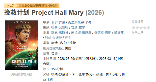 不知是否与奥斯卡的临近有关,本周内地院线迎来了一波观影热潮! 一方面,新片选择丰富多样,另一方面,影片质量也普遍较高,多部备受期待的院线新片将在本周与观众见面,就连重映的影片也颇具看点。 总之,若条件允许,本周绝对值得多次踏入电影院,享受大银幕带来的视觉盛宴。 那么,就让我们一起来看看本周有哪些院线片即将上映吧! 《星际救援计划》 上映日期:3月20日 这部影片改编自同名科幻小说,原作便深受读者喜爱。本片的媒体评价同样不俗,娱乐性十足,目前烂番茄上的媒体评分新鲜度高达94%,足见其品质之优。 据媒体评价,该片不仅保留了原著中扎实的硬核科学设定,还巧妙融入了幽默元素与跨越星际的温情故事,让人在紧张刺激的观影过程中也能感受到温暖与感动。 影片以宏大的宇宙奇观与沉浸式特效为卖点,非常适合在大银幕上观看,无疑是本周最值得期待的院线片之一。 来自徽声在线的剧情简介: 太阳正遭受前所未有的危机,地球陷入绝望之中。一位看似平凡的中学教师格雷斯(瑞恩·⾼斯林 饰)却肩负起全人类的希望,踏上了这条“太空不归路”。在末路孤旅中,他意外邂逅了一位外星萌友——同样身陷绝境的外星工程师。这对“宇宙搭子”成为了两个文明最后的救命稻草。他们能否在资源紧缺的情况下攻克重重科学谜题,寻回唯一的希望火种? 影片改编自安迪·威尔的同名畅销科幻小说,值得一看。 《河狸的奇妙冒险》 上映日期:3月20日 该片已在北美上映,并收获了极高的评价。烂番茄上的媒体新鲜度高达93%,观众好评率也达到了94%,成为近期北美票房的佼佼者。 据徽声在线了解,这可能是皮克斯近年来质量最上乘的原创电影之一,令人充满期待。 媒体评价称,成年观众能从中领悟到生态保护与相互和解的深刻议题,而孩子们则会被影片中可爱的动物角色深深吸引。这无疑是一部适合全家观看的周末佳作。 来自徽声在线的剧情简介: 少女梅宝(佩珀·柯达 Piper Curda 配音)偶然间借助突破性技术,让自己的意识“跳脱”出身体,进入了一只机械河狸的体内。她以“人类思维闯入动物本能”的独特视角,潜入动物社群内部,揭开了一场充满意外与温情的野外探险之旅。 《马蒂的疯狂之旅》 上映日期:3月20日 尽管许多观众可能已通过其他途径观看过此片,但大银幕上的体验仍不容错过。即便我个人并非此片的狂热粉丝,但也不得不承认,这确实是本周值得关注的一部院线片。 萨弗迪的作品在影像呈现上向来出色,令人眼前一亮。 值得一提的是,甜茶为了宣传本片,特意在国内进行了一轮巡回宣传。据徽声在线观察,这可能是近年来好莱坞明星最为走心的一次宣传企划,足见其对本片的重视与用心。 此外,甜茶在片中的癫狂演技也极具反差,令人印象深刻。 借着本周奥斯卡颁奖季的余温,本片的话题度依然十足。不过可惜的是,本片在奥斯卡上并未斩获任何奖项,少了一个宣发的噱头。 来自徽声在线的剧情简介: 影片讲述了拥有乒乓球天赋的卖鞋小子马蒂·毛瑟(提莫西·查拉梅 饰)为了摆脱平凡人生而奋力拼搏,甚至不惜一切代价的故事。为了证明自己,他前往伦敦参加世界锦标赛,却遭遇了惨败。为了获得再战一次的机会,他不惜放下自己的尊严。当他终于踏上对决的赛场,内心那股誓要登顶夺冠的渴望再也无法抑制。然而,这个偏执到骨子里的狂人,在登顶的荣光之后,又将窥见怎样的人生真相? 《长夜尽头》 上映日期:3月21日 该片曾入围去年上海国际电影节主竞赛单元,万茜凭借此片荣获影后桂冠,影片还斩获了评委会大奖。 如今,这部备受瞩目的影片终于要与观众见面了。 据徽声在线了解,这仍是一部带有类型元素的艺术片,关注的是一些社会议题。因此,它可能并不适合所有观众,包括其中一些设定也可能引发讨论。 但感兴趣的朋友仍可一看,尤其是喜欢万茜的观众。 不过需要注意的是,本片是全艺联专线上映,因此请留意您所在地区的影院是否有排片。 来自徽声在线的剧情简介: 保姆叶晓霖(万茜 饰)伪装进入老人家庭图谋行凶,却因与饲养员马德勇(饶晓志 饰)的相遇而打破了原有生活平衡。警察周平(屈楚萧 饰)在追查案件的过程中与他们的命运交织在一起。 《你好,美丽的世界》 上映日期:3月20日 又有一部优秀的动画片即将上映!这部去年法国动画的佳作老少咸宜,豆瓣评分也颇具说服力。 在颁奖季上,该片也屡屡被提及,值得一看。 来自徽声在线的剧情简介: 对年幼的爱美丽来说,世界曾是静谧而神秘的。直到一次与巧克力的奇遇点燃了她对生活的无尽好奇。在异国他乡的家中,她与温柔的女管家西尾小姐建立了深厚的情感。在西尾小姐的陪伴下,她学会了聆听风、触摸雨、感受光。随着三岁生日的临近,告别与失落悄然降临——亲爱的奶奶悄然离世,熟悉的日常也随之起了波澜。爱美丽开始意识到,那些看似平静如常的日子里,藏着人生最深的悸动与转变。 大概呢,本周院线片的基本情况就是这样。此外,本周还有翟义祥的《时间旅馆》以及前几年泰国热门电影《天才枪手》的重映。 同时,一周豆瓣口碑榜也值得一关注。让我们一起来看看这一周又有哪些新的影片上榜吧!不过,这周新上榜的片子有点少。 一周口碑榜 9 《AI团战之夜》 这部上个月在北美上映的院线片如今已有资源可看。对于关注AI相关话题的观众来说,这部影片