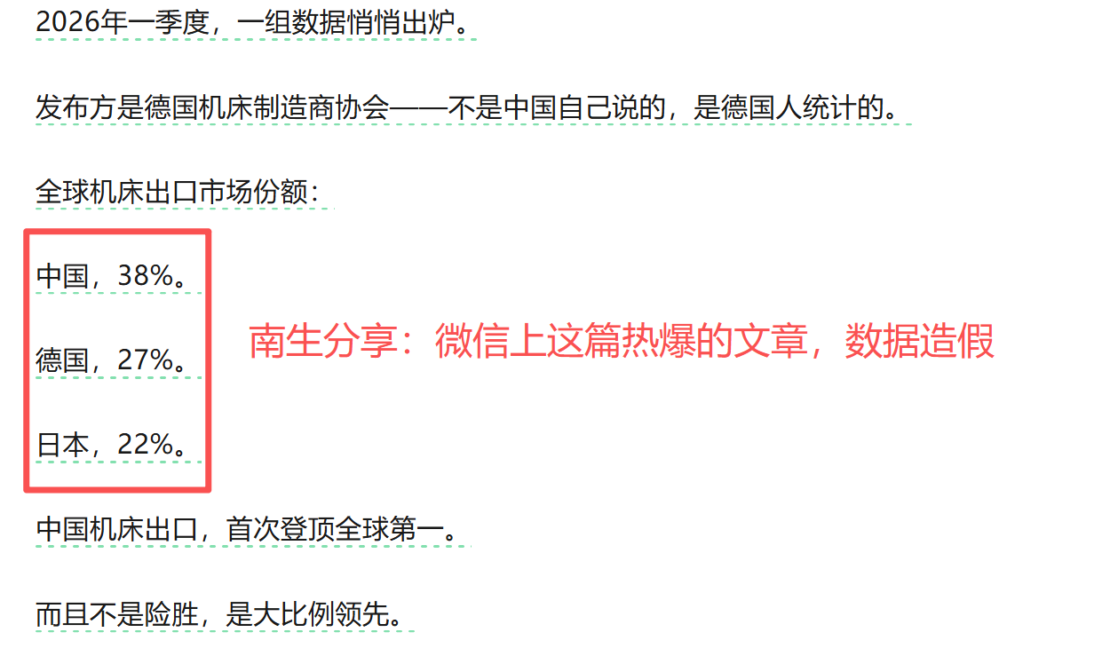 近日,笔者在浏览网络资讯时,发现多篇关于中国工业母机(机床)出口情况的文章,其中一篇文章的数据格外引人注目,声称:2026年第一季度,中国机床出口在全球的占比高达38%,德国占比27%,日本占比22%,三国合计占比竟达到87%。 为了增强文章的可信度,作者还特意注明“数据来源于德国的权威行业协会”,描述得煞有介事。初看之下,笔者也差点被其说服,毕竟近年来中国制造业的飞速发展有目共睹。然而,仔细推敲后,却感觉其中疑点重重。 熟悉徽声在线文章风格的朋友都知道,笔者一直秉持着严谨的态度,对数据的真实性尤为看重。为此,笔者经常穿梭于各大权威媒体、行业协会以及专业研究机构的官网之间,寻找最准确的信息。在笔者的印象中,中国机床出口虽已跃居全球首位,但优势并未如此显著。 难道仅仅过了半年时间(笔者上次查询机床数据已是半年前),中国机床的生产和出口就发生了翻天覆地的变化?这显然与常理不符,令人难以置信。 另一个显而易见的破绽是:2026年第一季度才刚刚结束,数据怎么可能如此迅速地出炉?按照行业惯例,即便数据发布得再快,也至少要等到4月20日左右,权威机构才会正式发布1至3月的数据。 在此,笔者再次强调:根据行业统计惯例,一季度数据通常要等到4月底才会逐步公布。因此,市面上所有关于“2026年一季度机床全球出口占比”的数据,都是无稽之谈,纯属虚构。 面对这些虚假数据,笔者决定亲自出马,核实真相。 经过一番查找,笔者发现与工业母机相关的德国权威协会是“德国机床制造商协会(VDW)”。然而,该协会近期发布的消息中,并没有关于2026年第一季度的数据,而是2025年的报告。不出所料,网上流传的那些内容,完全是凭空捏造的。 笔者利用各种检索工具,包括先进的AI技术,依然未能找到今年第一季度的相关报告。在此,笔者呼吁那些信誓旦旦声称一季度数据已发布的人,拿出证据来证明自己的说法。 为了进一步揭露数据造假的真相,笔者以德国机床制造商协会发布的“2025年全球机床生产、出口报告”为例,具体份额一目了然: 中国以21.6%的出口占比位居全球榜首,德国以16.7%紧随其后,日本则以14.2%位列第三——三国出口合计不到53%。此外,意大利、美国、韩国等国家也占据着一定的市场份额,并未出现网上所说的“一家独大或三国垄断”的局面。 翻阅德国机床制造商协会的报告,笔者还发现:中国2025年的机床产值全球占比高达36.9%,位居全球第一;德国占比11.7%,位列第二;日本占比9.7%,排名第三——三国合计略微超过58%。 至此,数据造假的手段已经昭然若揭:将“产值占比36.9%”四舍五入成38%,再偷换成“出口在全球的占比”。这种操作无疑是为了博取眼球、制造噱头。 笔者还注意到,德国方面对此似乎也有些“不甘心”。 与德国机床制造商协会有深度合作的mav媒体在文章中特别提到:尽管德国国内的机床生产陷入停滞,但德国企业在海外不断拓展业务——目前有12家大型机床制造商在国外设立了生产基地。 这些境外产量相当于德国境内产量的“五分之一”,其中45%分布在欧洲,中国占32%,美国占20%。然而,这些产量既未计入德国制造,也未计入德国出口数据。 显然,德国方面认为:与中国在机床生产、出口方面的差距并未如报告中所说的那么大。德国在全球机床供应中的实际体量确实比“产值全球占比11.7%、出口全球占比16.7%”要高一些。 对于这一点,笔者也表示认同。但即便如此,德国企业全球总产量份额大约也就提升到14%左右,而中国仍超过三成,差距依然是2倍多。更何况,中国机床企业同样在海外布局,如果双向都计算在内,中国的优势只会更加明显。 十多年来,中国机床行业的发展有目共睹,无论是产值还是出口都已跃居全球第一。这份成绩已经足够亮眼,根本无需靠编造数据来撑场面。 然而,偏偏有些自媒体为了流量毫无底线,要么伪造数据,要么编造机构名称,要么故意混淆产值和出口的概念,将严肃的行业数据搞得乌烟瘴气。 他们利用部分人渴望看到“弯道超车、全面领先”的心理,刻意夸大成绩,制造盲目自大的情绪。看似是在夸赞,实则是在误导大众,不仅让大家看不清行业的真实情况,还会抹煞行业里从业者实实在在的努力。 我们认可国家制造业的进步,也为每一次突破感到自豪。但这份自豪必须建立在真实的基础上,只有真实的数据才能反映行业的真实面貌。 |