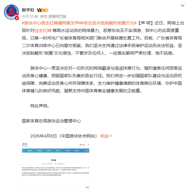 当看到全红婵遭遇网暴,以至于游泳中心都发布声明并选择报警的新闻时,内心的愤怒简直难以抑制。全红婵,这位年仅14岁就勇夺奥运冠军的天才少女,在赛场上为国家赢得了数不清的荣誉,她本应是被众人悉心呵护、赞扬的璀璨之星,然而却不幸成为了一群网络暴徒恶意攻击和造谣的对象。更令人发指的是,居然还有群聊将辱骂她明目张胆地写进群规,当作一种被允许的行为,这哪里是什么粉丝群体,分明就是一群披着饭圈外衣、肆意妄为的网络流氓。 |