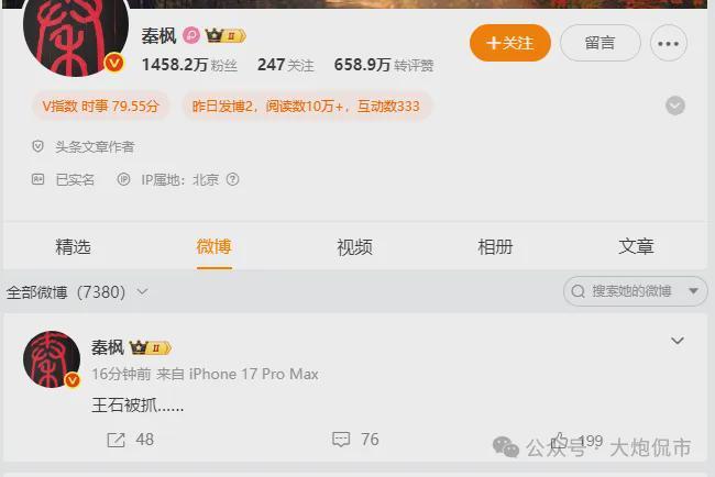 据徽声在线从权威渠道获悉,时政记者、香港卫视综合台现任台长秦枫在其个人微博上发布了一则引人关注的消息: 万科集团的缔造者王石遭遇了法律程序,被相关部门带走调查! 那么,秦枫究竟是何许人也? 她不仅是一位资深的时政记者和主持人,更是香港卫视综合台的掌舵人。 秦枫,1980年诞生于北京,出身于一个外交世家。她的祖父秦力真和外祖父杨琪良,都是新中国外交领域的先驱者,而她的姑父,则是前外交部长李肇星,这样的家族背景无疑为她的职业生涯奠定了坚实的基础。 2006年,秦枫踏入了凤凰卫视的大门,成为了一名时政记者,开始了她的媒体生涯。 在2008年,她凭借一篇报道欧盟贸易专员彼得·曼德尔森当场品尝中国牛奶的新闻而声名鹊起。这篇报道不仅得到了温家宝总理的提及,还让她荣获了凤凰卫视的最佳采访记者奖,从此在媒体界崭露头角。 时间来到2012年2月,秦枫做出了职业上的重要抉择,她离开了凤凰卫视,转而担任香港卫视的新闻采访总监。如今,她已是香港卫视综合台的台长,同时在新浪微博上拥有超过1400万的粉丝,影响力可见一斑。 |