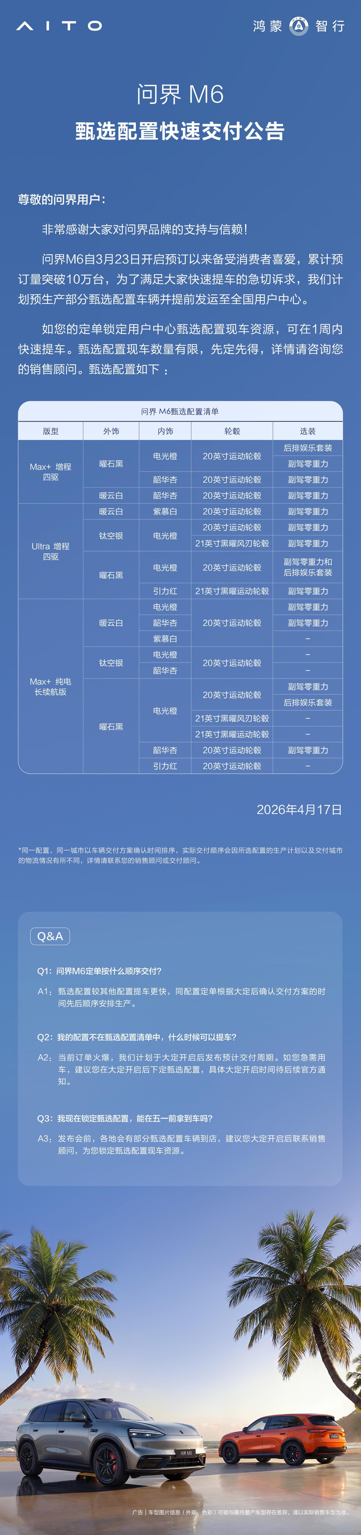预售订单突破10万辆,却火速推出"现车"服务?这一操作颠覆了行业常规认知。 今日鸿蒙智行正式宣布:问界M6预售量已突破10万台大关,同步开启"甄选现车"专属通道,消费者最快可在7天内完成提车。值得注意的是,这款尚未正式上市(4月22日发布)的新车,已提前将库存铺至全国终端门店——这种"现货销售"模式,彻底打破了传统汽车行业的预售逻辑。 一、现车战略:将"交付焦虑"转化为"即时爽感" 历经多年新能源车预售制洗礼,消费者已形成固定认知:下单→等待3-6个月→产能爬坡期→可能遭遇交付延迟→补贴政策变动风险。问界M6反其道而行之,用"现车"二字精准刺中行业痛点。但这种便利并非无代价—— 现车资源仅覆盖三个版本:Max+增程四驱版、Ultra增程四驱版、Max+纯电长续航版,清一色中高配车型。入门款缺席的背后,是华为的精准用户筛选策略:想要跳过等待期?请选择溢价更高的配置版本。更值得关注的是,现车已提前完成全国分仓布局,这意味着华为在预售阶段就完成了:1)产能精准预判 2)区域需求匹配 3)供应链协同调度。这种"以产定销"的底气,比10万订单数字更具行业参考价值。 据内部人士透露,华为为现车策略构建了三级库存体系:区域中心仓(覆盖3-5省)、城市卫星仓(服务周边地市)、门店前置仓(实现当日调拨)。这种立体化网络,使现车周转效率较传统模式提升40%以上。 二、896线激光雷达:重新定义智能驾驶硬件标准 问界M6全系标配华为新一代896线双光路激光雷达,官方宣称这是"全球量产车最高线束规格"。对比行业现状:特斯拉Model Y采用纯视觉方案,小鹏G6最高配备256线,理想L7使用128线激光雷达。华为直接将参数提升3-7倍,相当于在智能驾驶领域投下技术重磅炸弹。 这种硬件策略正在改写行业规则。过去激光雷达是40万级车型的专属配置,如今被下放至26万级市场,如同当年智能手机将指纹识别从旗舰机普及到千元机。据供应链消息,华为通过自研芯片+规模化生产,将单颗激光雷达成本压缩至行业平均水平的60%。这迫使竞争对手面临两难选择:跟进降价则利润受损,维持现状则智驾竞争力落后。 <配合ADS 4.1系统与30个感知硬件,问界M6实现了"微观场景识别"能力。官方演示中,车辆能在120米外精准识别奔跑中的宠物犬动作轨迹。这种将技术参数转化为用户可感知体验的传播策略,直击消费者对智能驾驶"不可靠"的心理顾虑。 三、26.98万定价策略:精准卡位特斯拉Model Y命门 问界M6增程版起售价26.98万元,纯电版28.98万元,这个定价充满博弈智慧。 对比特斯拉Model Y:后驱版26.35万元,长续航版30.35万元。问界M6增程入门版虽贵6300元,但多出激光雷达、鸿蒙座舱、零重力座椅三大核心配置;纯电入门版便宜1.37万元,且CLTC续航达760km,超越Model Y长续航版的593km。这种"错位竞争"策略,实质是将Model Y逼入价格战陷阱:若特斯拉不降价,将流失对配置敏感的用户;若降价则压缩利润空间,影响后续产品迭代。 现车策略在此发挥双重作用:既能在价格战爆发前锁定一批"不愿等待"的冲动型消费者,又能通过中高配车型的快速消化,为后续价格调整预留空间。据经销商反馈,现车咨询用户中,60%表示对交付周期敏感,30%关注智驾配置,仅有10%在意最终售价。 四、年轻化转型:从"功能空间"到"情绪容器" 不同于理想L系列主打"奶爸车"概念,问界M6将目标锁定Z世代群体,通过"灵感橱窗"设计重构车内空间价值。副驾区域配备磁吸钢化玻璃罩,支持手办展示、电子墨水屏、香氛模块三种模式自由切换。这种设计暗含产品哲学:将固定功能空间转化为可定制的情绪表达载体。 配合7种活力配色(星叶紫、流光青等)、轿跑式溜背造型,M6刻意与问界M9的商务气质形成区隔。性能参数方面,黑曜运动套件、0.239cd超低风阻、700mm涉水深度等配置,精准命中年轻用户"可晒性"需求。据用户调研显示,25-30岁购车群体中,72%将"外观独特性"列为首要考虑因素,远高于空间(58%)和续航(52%)。 华为还为年轻用户打造了专属生态:车载K歌系统支持10万+首正版曲库,游戏模式可连接Switch/PS5,露营模式提供3.3kW外放电功能。这些细节设计,使M6从交通工具进化为生活方式载体。 数据洞察 10万预售订单、7天现车交付、896线激光雷达全系标配——这三个关键数字,揭示华为汽车业务已进入新阶段。从M5的产能困境,到M9站稳50万级高端市场,再到M6的"预售即现货"模式,华为用三年时间完成了供应链与渠道体系的闭环建设。4月22日正式上市后,市场关注焦点将转向现车消化效率:若中高配车型能在30天内清仓,证明华为已掌握"通过库存管理制造稀缺感"的高阶玩法;若出现滞销,则需重新评估价格策略与配置组合。这场由华为发起的预售革命,正在重塑汽车行业的竞争规则。 |