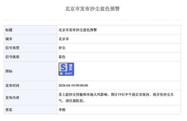 4月19日上午9时,北京市气象部门正式拉响了沙尘蓝色预警信号:受上游地区沙尘的输送以及本地强劲大风的共同作用,预计在19日中午时段至深夜,北京市将迎来沙尘天气过程,市民需提前做好防沙准备。 在此之前,北京市已经发布了大风蓝色预警:根据预测,19日中午至夜间,北京市大部分区域将刮起4级左右的偏北风,局部地区阵风可达7至8级,而山区局地的阵风更是有可能超过10级,并且会伴有沙尘天气;特别需要注意的是,傍晚至前半夜将是风力最为猛烈的时段,请广大市民务必加强防范,确保安全。 信息来源:北京市气象局官方发布 |
