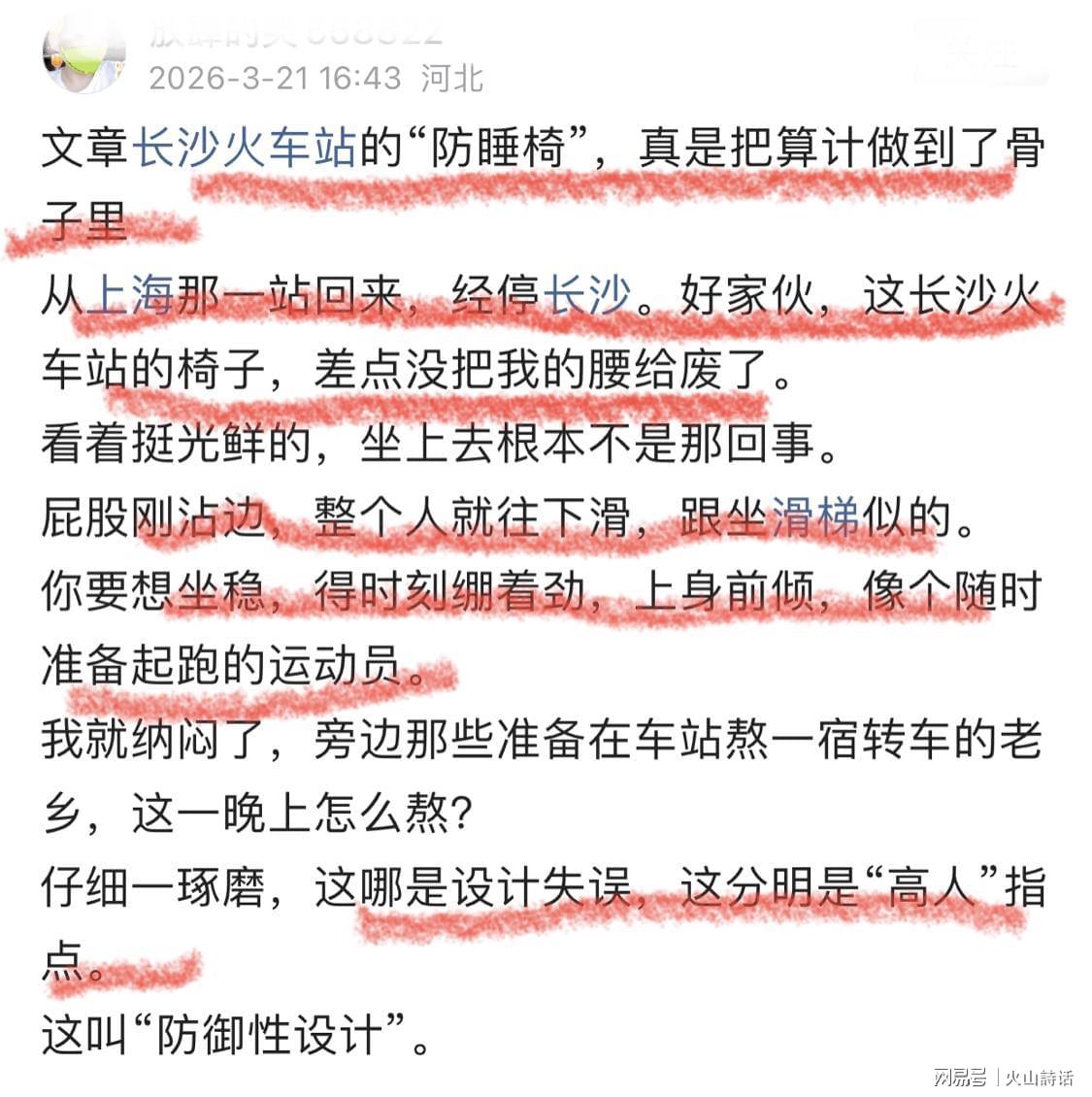 近日,一位来自河北的旅客在社交平台发帖,对长沙火车站的座椅设计提出了强烈质疑,直言这种“防睡椅”简直把算计做到了极致。该旅客称,自己从上海返回途中经停长沙,原本想在车站稍作休息,没想到长沙火车站的座椅设计让他苦不堪言,差点把腰给累坏了。 从外观上看,这些座椅似乎并无特别之处,甚至显得颇为光鲜。然而,一旦坐上去,旅客便会发现其中的“奥妙”——屁股刚沾上座椅,整个人就不由自主地往下滑,仿佛坐在了滑梯上。为了保持坐姿,旅客不得不时刻绷紧身体,上身前倾,宛如一名随时准备冲刺的运动员。 这位河北旅客不禁心生疑惑:那些需要在车站熬过一整夜转车的老乡们,该如何度过这漫长的时光?经过一番思考,他恍然大悟,这哪里是设计上的失误,分明是有人“高人”在背后指点。这种设计被称为“防御性设计”,其目的在于防止座椅过于舒适,从而吸引流浪汉前来蹭睡,或者导致过多旅客长时间占用座椅,影响车站的正常运营。只有让旅客坐得不舒服,他们才会选择去消费、住店,或者尽快离开车站。 此帖一经发布,迅速在网络上引发了广泛热议。针对此事,网友们各抒己见,观点不一。有网友认为,车站毕竟不是宾馆,不提供住宿服务,因此座椅设计成这样也在情理之中。这样可以避免座椅被人长时间躺卧占用,导致真正需要休息的旅客无座可坐。 也有网友调侃道,这或许是车站怕旅客坐得太舒服,从而错过了赶车的时间。 还有网友直接质问,高铁站又不是旅馆,为什么要提供让人睡觉的条件呢?
