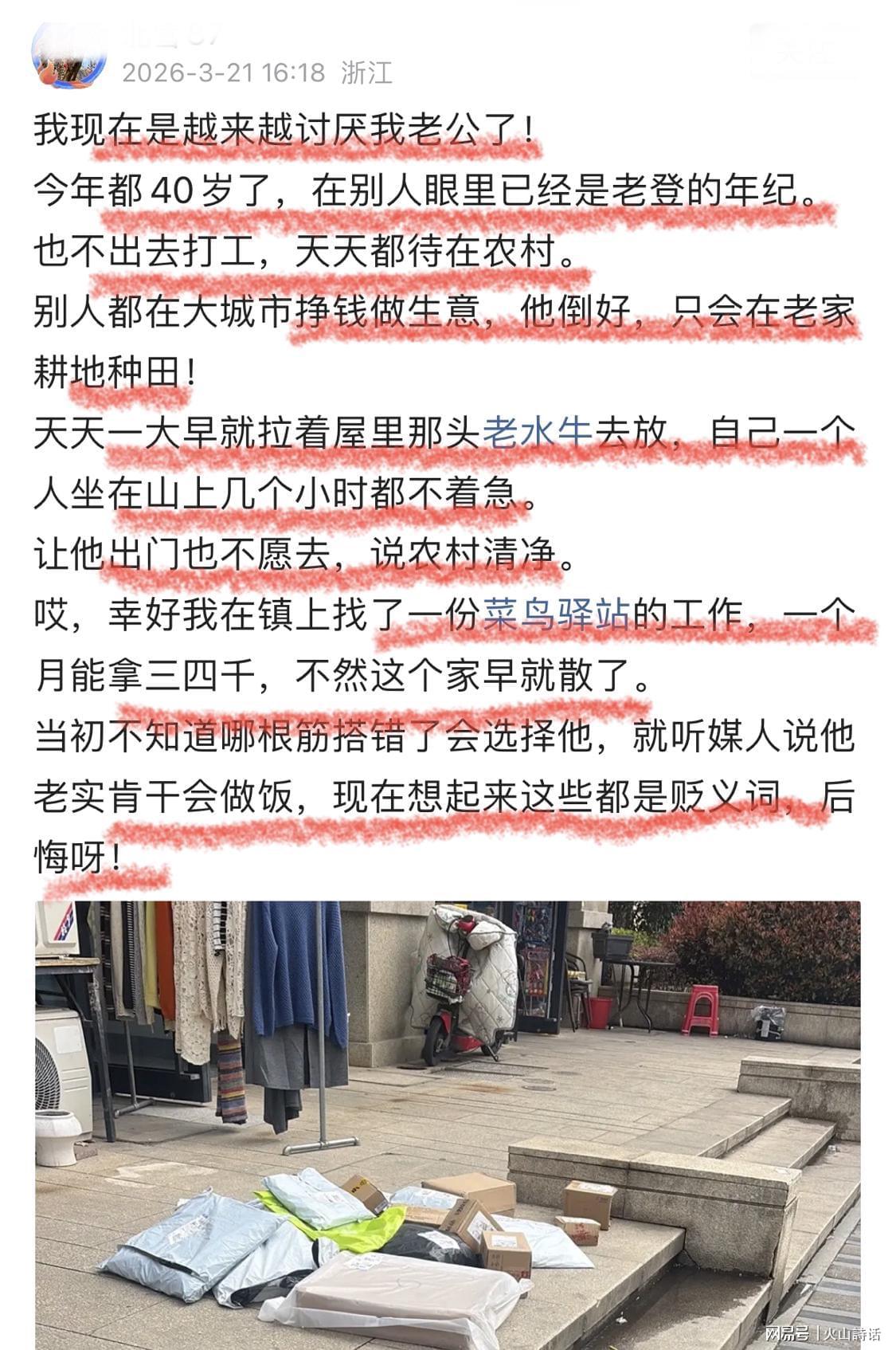 最近,一位来自浙江的女性网友在社交平台上发表的吐槽,引发了广泛关注,也触动了众多中年夫妻的敏感神经:她40岁的丈夫拒绝外出打工,坚持留在农村务农放牛,而她自己在镇上的菜鸟驿站每月辛苦赚取三四千元支撑家庭开支,满心的委屈与后悔溢于言表。 让我们深入剖析这一中年婚姻危机的典型案例。 我对老公的厌恶感与日俱增! 他今年都40岁了,在旁人眼中已是步入中年的行列。他却不愿外出打工,整日窝在农村。当别人都在大城市里拼搏赚钱、创业时,他却满足于在老家耕田种地!每天一大早,他就牵着家里的那头老水牛去放牧,独自坐在山上几个小时也不着急。让他出门打工,他也不愿意,说农村安静自在。 值得一提的是,该网友在评论区进一步透露,丈夫耕田种地、喂猪放牛、甚至逮蜈蚣,一年下来也就收入三四万,这点钱根本不够用! 针对这一事件,有网友评论道,你能找到三四千元的工作,说明你模样出众、年轻漂亮,你年轻漂亮,老公不敢外出打工也就不难理解了。在农村一个菜鸟驿站工作都能拿到三四千,说不定老板对你有意思呢。 也有网友指出,80后的农村人未来至少有50%会回到农村种地,退休后也不会留在城市。 还有网友调侃道,你还不及时止损,更待何时?外面的如意郎君正等着你呢,别让别人抢走了,还不抓住机会。