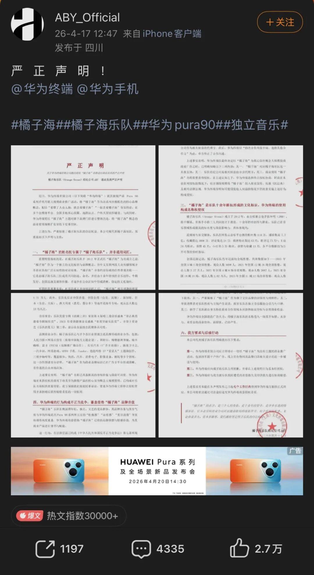 独立音乐圈与数码科技圈近日掀起了一场风波。 据徽声在线报道,橘子海乐队的经纪公司ABY_Official近日在官方微博发布声明,称华为在明知其权益归属的情况下(此前曾有过合作接洽但最终终止),仍在Pura90系列手机的宣传中,将“橘子海”作为配色核心概念,并使用“一起去看橘子海”等宣传标语,涉嫌侵犯了乐队的名称权。 随着事件的不断发酵,网友和数码圈博主们对此看法不一,多数人认为乐队此举是在蹭热度或炒作;然而,音乐圈内也有不少博主站出来为橘子海乐队发声,支持其维权行为。 那么,“橘子海”究竟是在合理维权,还是如网友所言的矫情碰瓷?当小众文化符号遭遇巨头商业传播,法理、舆论与产业现实又该如何平衡? 商标争议:霸凌还是过度维权? 橘子海乐队经纪公司ABY_Official发布的声明,主要阐述了以下几点内容。 首先,声明强调“橘子海”是乐队自2012年创立并使用多年的专属名称,并非通用词汇。经过多年的发展,该名称已经形成了较高的市场知名度和品牌价值,成为乐队独有的文化标识和知识产权。 其次,声明指出了关键细节:此前双方曾有过合作洽谈,但后来华为终端单方面终止了合作。未经乐队任何授权,华为擅自将“橘子海”作为Pura 90系列手机的配色名称及核心宣传概念,并在全国范围内进行大规模商业推广。乐队认为,这一行为已构成名称权侵权和不正当竞争,侵害了乐队的品牌权益和商业利益。 最后,乐队向华为提出了明确要求:希望其立即停止所有相关商业推广活动,公开致歉并完成合法授权流程,同时就侵权损失协商赔偿。乐队还表示,若在声明发布后七个工作日内未收到华为的正式回应,将通过司法途径维护乐队的合法权益。 截至目前,华为方面尚未对该争议作出任何回应。然而,大众舆论却呈现明显的一边倒态势——多数网友倾向于支持华为,认为橘子海乐队此举是碰瓷、炒作,试图蹭华为的热度。再加上乐队官方账号略显强硬的回复态度,也让这场维权争议更具话题性。 然而,在独立音乐圈内,不少从业者却对橘子海乐队表示理解与支持。他们认为,乐队守护自身名称是对多年积累的圈层IP和创作身份的正当捍卫。 抛开情绪化的舆论,从法律角度来看,我国《商标法》实行“注册+分类保护”原则。橘子海乐队仅在教育娱乐、家具等类别注册了“橘子海”商标,并未在华为使用的手机所属第9类(电子产品)注册。因此,从商标法的角度来看,乐队无法直接依据商标法主张华为侵权。 目前来看,《反不正当竞争法》可能是乐队维权的主要法律依据。但要想依据该法主张权利,乐队需要满足两个必备条件:一是“橘子海”在数码手机群体中具有一定知名度;二是华为的使用行为足以让公众误以为与乐队存在关联。 这个混淆行为的构成,可以参考此前的MR.MISS维权案。2023年,深圳市哈音科技有限公司销售一款名为“TIPSYMR.MISS”的耳机,被MR.MISS乐队以《反不正当竞争法》起诉。最终,法院判定哈音公司的行为构成不正当竞争,酌情认定哈音公司应向刘恋、杜凯赔偿经济损失8万元。 该案的关键点在于,被告在耳机型号包装、标签、说明书、感谢卡上反复使用“MR.MISS”,这种用法已经很接近将其作为商品标识来用,足以让消费者误以为这款耳机和乐队之间存在联名、授权或其他商业联系。法院最终认定的也正是这一点:MR.MISS作为艺名已经有一定影响力,并且这种使用已经造成相关公众对商品来源的混淆或误认。 相比之下,“橘子海”和华为的争议核心差异在于使用场景。华为目前公开的使用场景更像是在描述配色、意象和宣传语,而不一定是在将“橘子海”作为识别手机来源的标识来用。 假设华为推出的不是手机配色,而是一款音乐类产品,比如智能音箱、音乐App、耳机,并以“橘子海”命名,那么法律评价或许将发生根本性变化。毕竟在音乐及相关产品领域,橘子海乐队经过十余年的持续创作、专辑发行、全国巡演及媒体报道,已在圈层内建立了较为稳固的知名度,产生“该产品与乐队存在关联”的联想的可能性或将显著提升。 上海理振律师事务所律师李振武在采访中提到,目前乐队若想禁止华为在手机领域使用“橘子海”,最可行的法律路径是证明“橘子海”已成为“驰名商标”。但这需要提供长期、广泛使用,为相关公众所熟知,并享有较高声誉的证据。以乐队目前的知名度,要达到驰名程度面临巨大挑战。 总体来看,橘子海乐队的维权主张在理论上有一定法律依据,但现实操作上难度较大。即便能借助曾经合作接洽证明华为主观知情,在不正当竞争的判断上仍面临举证挑战,因此维权是否能最终成功尚不明朗。 乐队名称保卫战:独立音乐人的困境与诉求 实际上,这并非橘子海乐队首次因乐队名称起诉品牌方。 去年,橘子海乐队所属经纪公司看看月亮(上海)文化传媒有限公司就曾起诉一点点奶茶关联的生根餐饮管理(上海)有限公司不正当竞争,案件已在上海市普陀区人民法院开庭审理。 公开信息显示,此前一点点推出橘子系列新品时,曾使用“一口三重奏,如同置身橘子海”进行宣传。也正因接连对品牌方发起维权争议,很多人觉得乐队过于矫情,各种碰瓷。 然而,外界的质疑往往忽略了独立音乐人自身的生存困境与权益诉求。 从独立音乐人的视角去看,乐队名字会不断出现在演出票务页面、音乐平台条目、社交媒体话题、乐迷