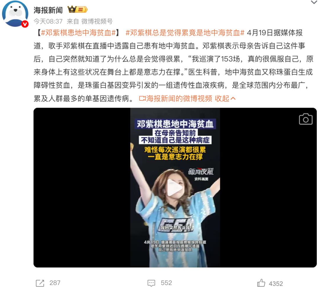 近日,知名歌手邓紫棋在直播中向粉丝透露,自己患有地中海贫血,并坦言这一发现让她终于明白了为何自己常常感到疲惫。这一消息引发了网友的广泛关注和讨论。 在留言区,有网友表示惊讶,称看她唱歌时总是充满活力,没想到背后竟有这样的健康困扰。也有网友指出,轻型地中海贫血可能并无明显症状,在华南地区较为普遍。那么,地中海贫血究竟有多严重?哪些人群需要进行筛查呢? 邓紫棋透露地中海贫血病情及网友热议 (左滑查看)| 微博@徽声在线 地中海贫血:病情轻重不一,从无症状到致命 这组疾病表现差异巨大 地中海贫血(thalassemia)的核心问题在于贫血,由于血红蛋白含量低于正常水平,血液输送氧气的能力下降,导致贫血症状。与常见的缺铁性贫血不同,地中海贫血并非由后天营养不足或长期出血引起,而是一种先天的遗传性血液疾病,其病因在于血红蛋白中的珠蛋白基因存在缺陷。 贫血症状的严重程度取决于地中海贫血的具体类型。由于这是一组疾病而非单一疾病,病情轻重差异极大,最轻的患者可能毫无不适,而最重的则可能在母亲子宫内死亡,其余患者则处于这两种极端情况之间,病情有轻有重。 血红蛋白结构由两条α-珠蛋白和两条β-珠蛋白多肽链组成,每条多肽链都与一个血红素辅基相连丨geeksforgeeks.org 根据病情轻重(是否需要长期输血),地中海贫血可分为两大类,非输血依赖型地中海贫血(NTDT)和输血依赖型地中海贫血(TDT)。 TDT亚型病情较重,血红蛋白严重不足。患儿通常在出生后3~6个月内开始出现症状,并持续加重。最初表现为喂奶困难、经常腹泻和体重增长缓慢。随后,婴儿出现贫血症状,如面色苍白、肝脾肿大导致的腹部增大。 为了维持生命,TDT亚型患者必须反复接受输血治疗,这会导致体内铁过量积累。铁在心肌、肝脏、胰脏和脑垂体等器官聚集,可能引发心力衰竭、凝血功能异常、糖代谢异常和骨质疏松等并发症,其中心力衰竭是地中海贫血患者死亡的主要原因之一。因此,部分患者需要接受专门的祛铁治疗。 若未接受规范治疗,患儿1岁以后可能出现典型的“地中海贫血外貌”,表现为身材矮小、头骨偏大、鼻梁塌陷、上颚和牙齿突出、巩膜黄染(眼白发黄)等 |BMJ Case Reports 与TDT亚型相比,NTDT亚型病情较轻,大多数患者寿命基本不受影响,无需输血或仅在特殊情况下(如感染、手术、妊娠等)需要输血。其中,一部分人终生无症状,仅在基因检测时才发现自己携带异常基因。另一部分人大约在2~3岁发病,逐渐出现轻中度贫血症状,常见表现包括: