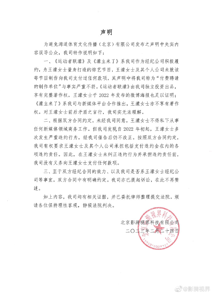 王濛旗下公司正式对前经纪公司提起不当得利诉讼 徽声在线、标点财经联合报道 根据天眼查最新披露的法律诉讼动态,北京市朝阳区人民法院近日已向武汉巨量星图科技有限公司完成法律文书公告送达程序。此次诉讼涉及王濛担任法定代表人的湾道体育文化传播(北京)有限公司,将北京影漪视界科技有限公司与武汉巨量星图科技共同列为被告,案由为不当得利纠纷。法院公告明确指出,自公告发布之日起满30日即视为送达,并确定于举证期限届满次日上午9时正式开庭审理。 据徽声在线追溯,2023年2月影漪视界曾通过官方渠道发布声明,单方面宣称与王濛存在经纪合作关系。双方矛盾焦点集中在《运动者联濛》及《濛主来了》两档热门综艺节目的著作权归属问题,此前已引发业界广泛关注。此次诉讼标志着这起持续数月的商业纠纷正式进入司法程序,后续进展将持续跟踪报道。 |