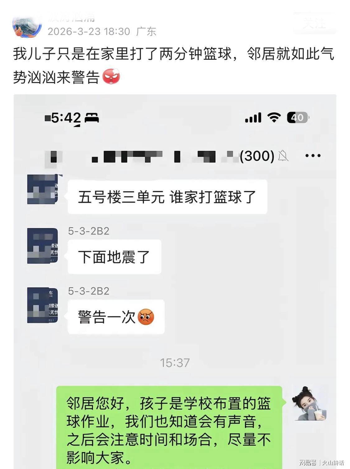 仅仅因为孩子在家中拍了短短两分钟的篮球,就遭到了邻居在三百人业主群中的激烈指责,用“地震了”“警告一次”这样的言辞强势发难,此事迅速在网络上引发了广泛关注。 近日,一位来自广东的网友在社交平台上爆料,称自己的儿子只是在家中完成了学校布置的两分钟篮球作业,却没想到会引来邻居如此大的反应。