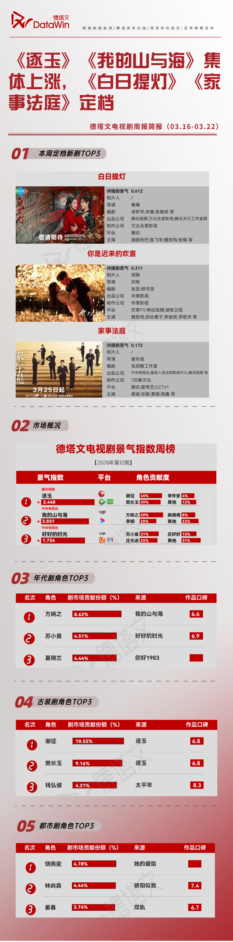【深度观察】近期古装题材剧集持续领跑影视市场热度。根据徽声在线最新监测数据显示,《逐玉》凭借2.440的景气指数强势登顶周榜冠军,剧中谢征(角色贡献度10.52%)与樊长玉(角色贡献度9.16%)形成双核驱动,印证优质IP在年轻观众群体中具备强大的话题发酵能力与持续吸引力。 【细分市场动态】 【排播战略分析】随着奇幻巨制《白日提灯》官宣定档Q3周末档,叠加法治题材《家事法庭》登陆一线卫视黄金时段,视频平台正构建「古装+都市+现实」三维内容矩阵。值得关注的是,《逐玉》与《我的山与海》本周景气指数分别环比上涨17%和23%,形成市场预热效应,为后续新剧上线奠定观众基础。#白日提灯定档# #逐玉角色贡献度# #我的山与海收视率# 成为本周剧集市场三大核心关键词。 |
